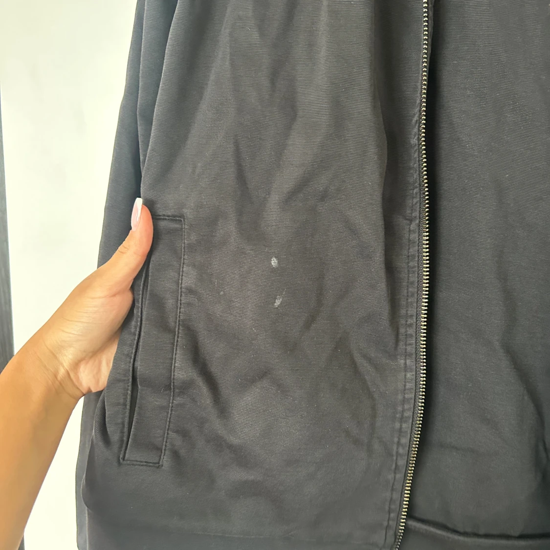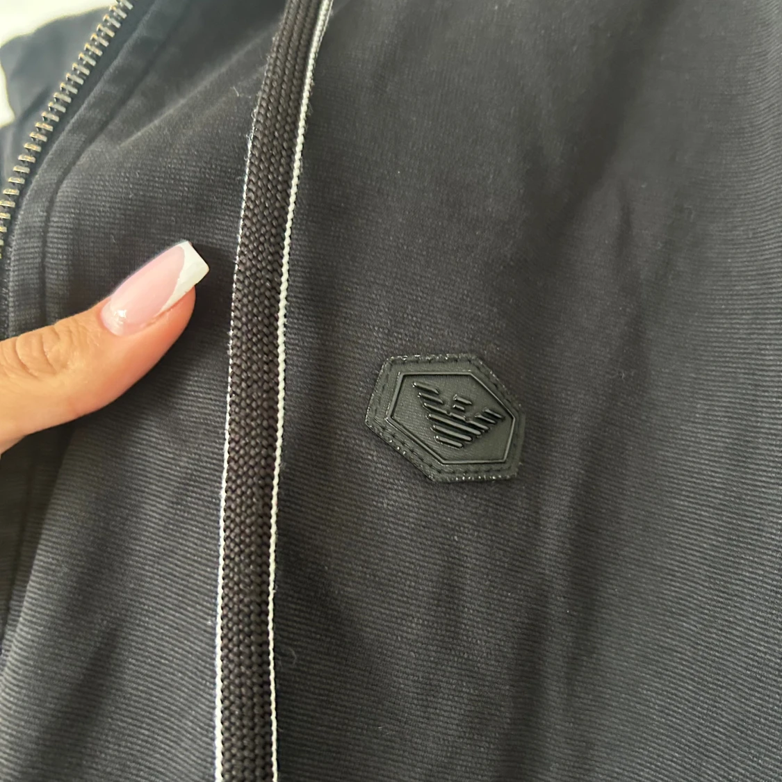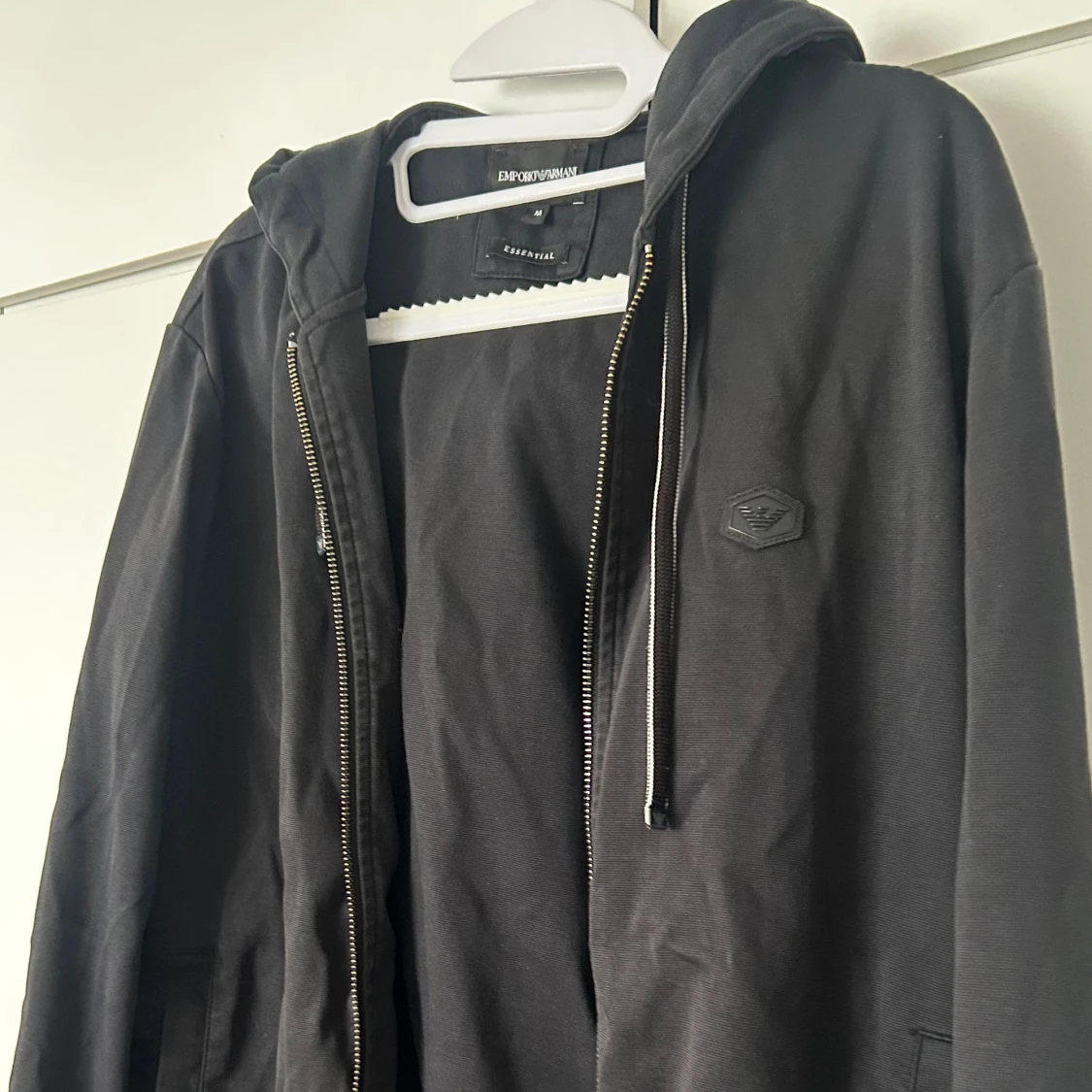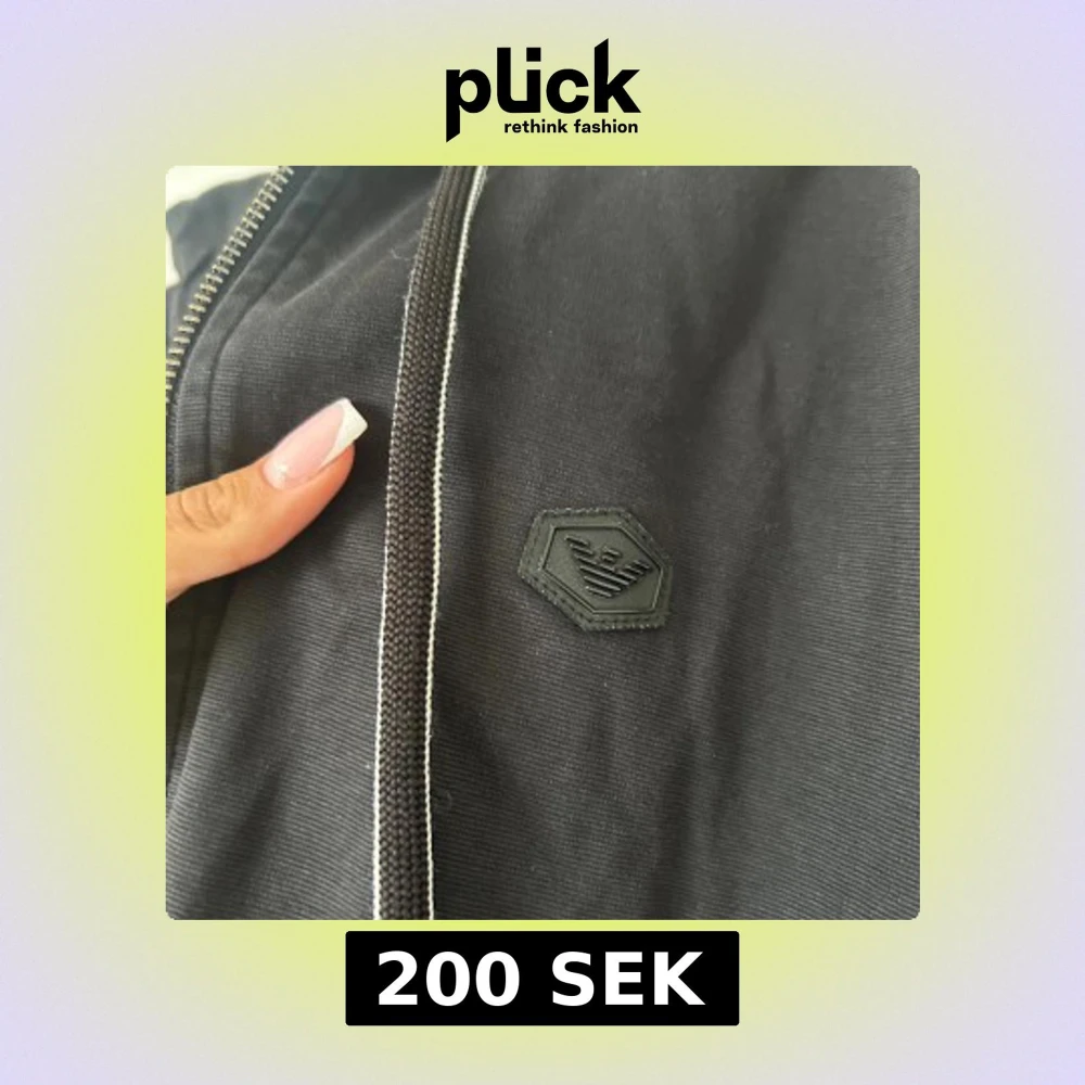 Svart hoodiejacka från Emporio Armani med dragkedja och luva. Jackan har ett stilrent svart logomärke på bröstet och praktiska fickor. Materialet är mjukt och känns skönt mot huden, perfekt för chill dagar. Dock har koftan en defekt som ni ser på sista bilden.