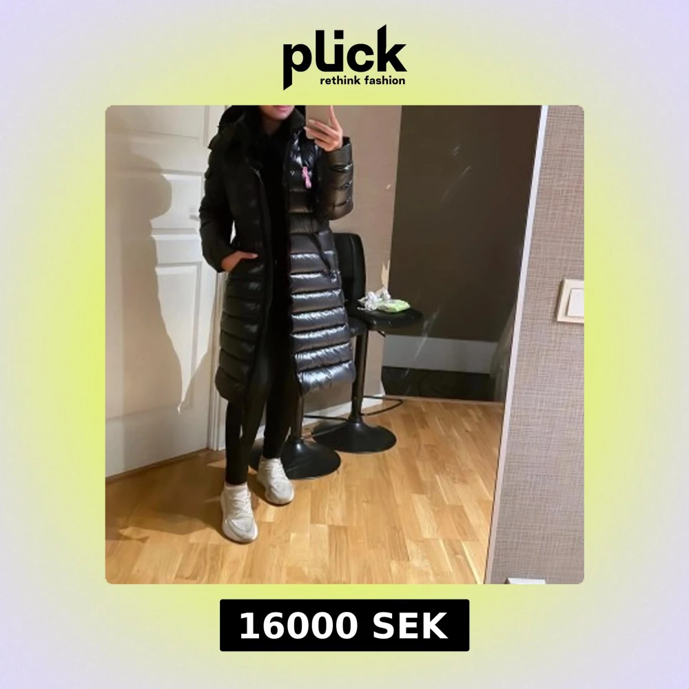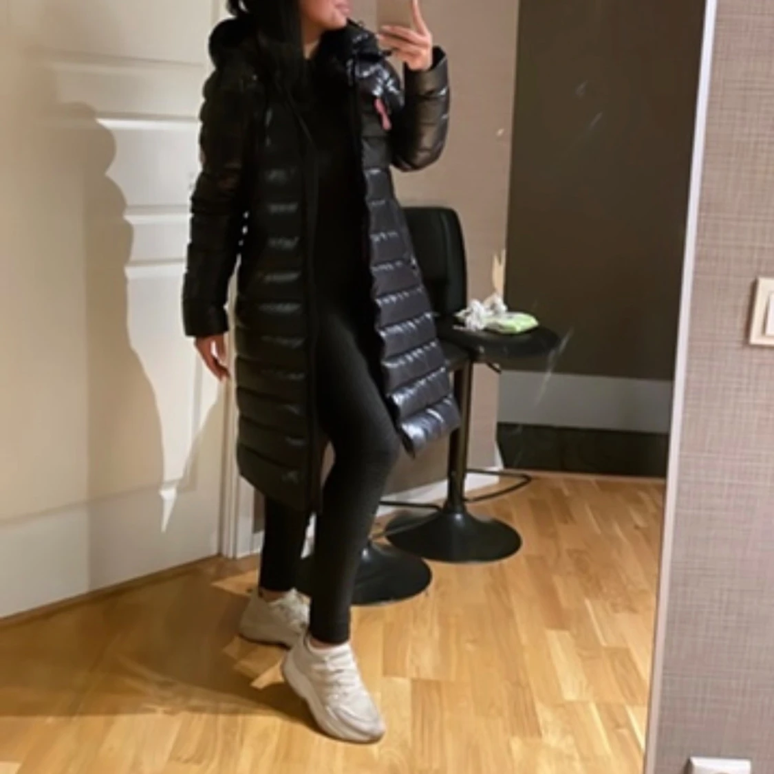 Säljer en svart, lång och glansig dunjacka från Moncler med huva och dragkedja. Jackan har quiltad design och Moncler-logga på ärmen. Perfekt för kalla dagar när du vill hålla stilen och värmen.