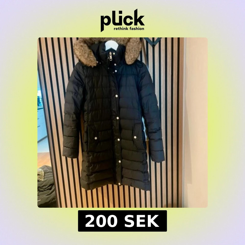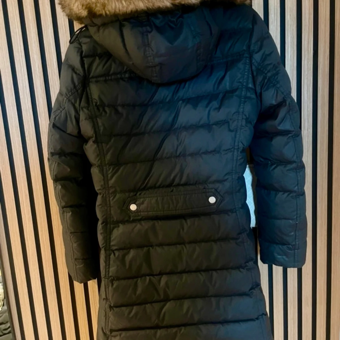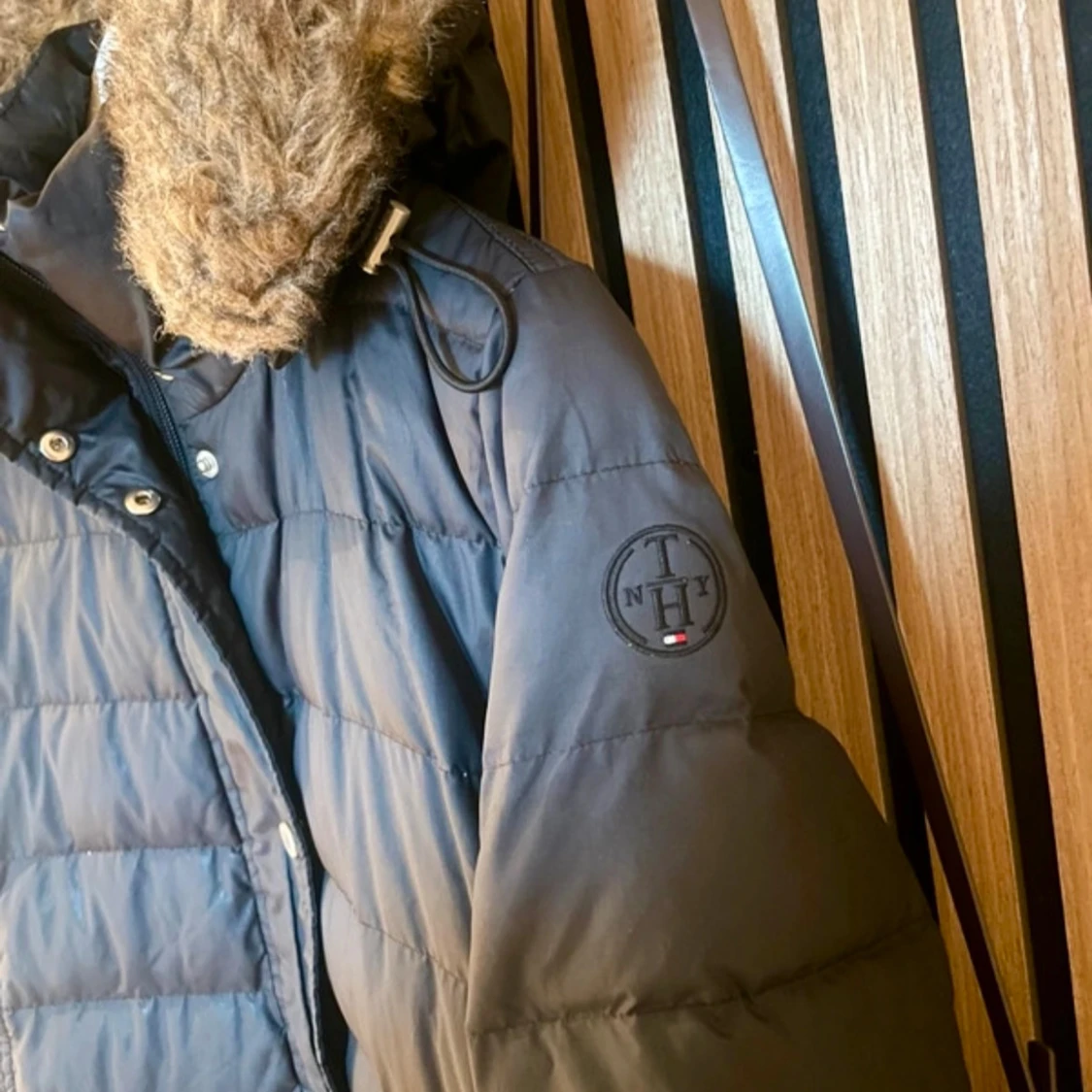 Lång svart dunjacka från Tommy Hilfiger med huva och fuskpäls, quiltad design och dragkedja samt knappar framtill. Jackan har två stora fickor med tryckknappar och logga på ärmen. Perfekt för kalla dagar.