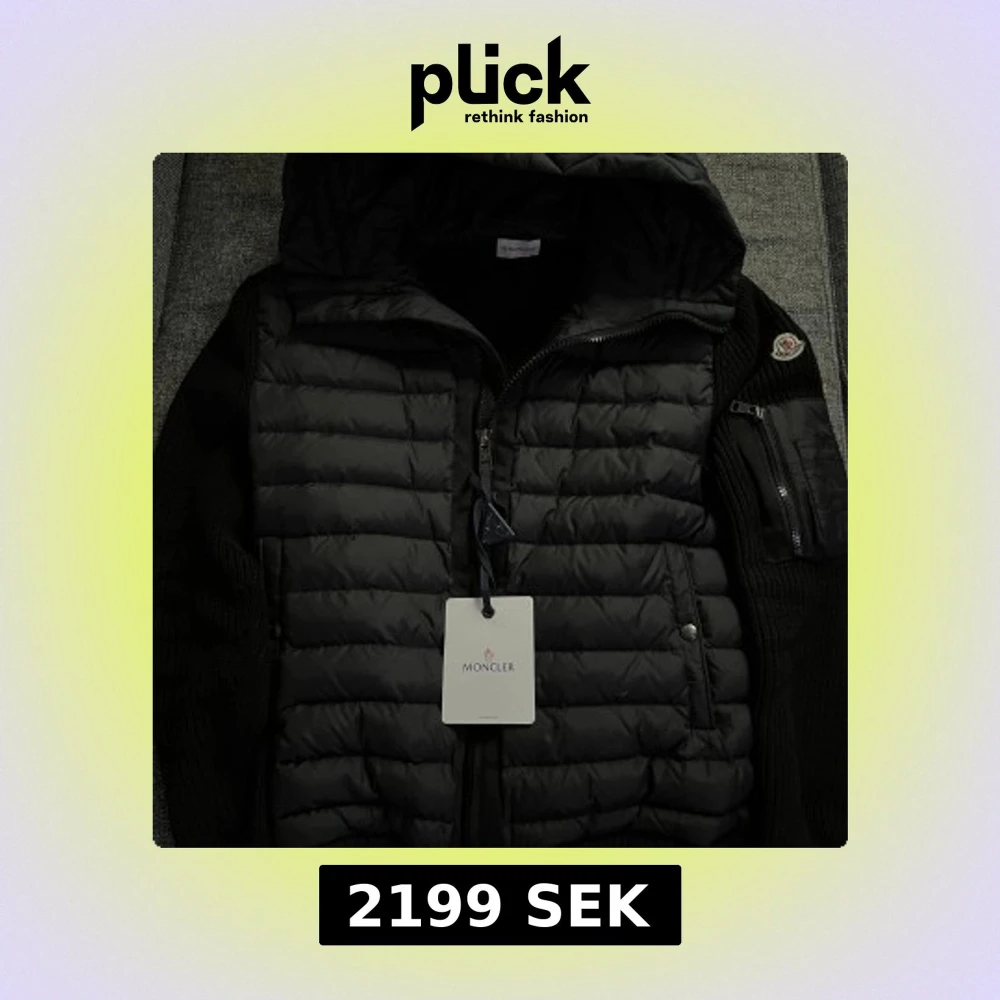 Säljer en svart pufferjacka från Moncler med stickade ärmar och huva. Jackan har dragkedja framtill, sidofickor med dragkedja och en Moncler-logga på ärmen. Perfekt för kyliga dagar och riktigt snygg streetstil.