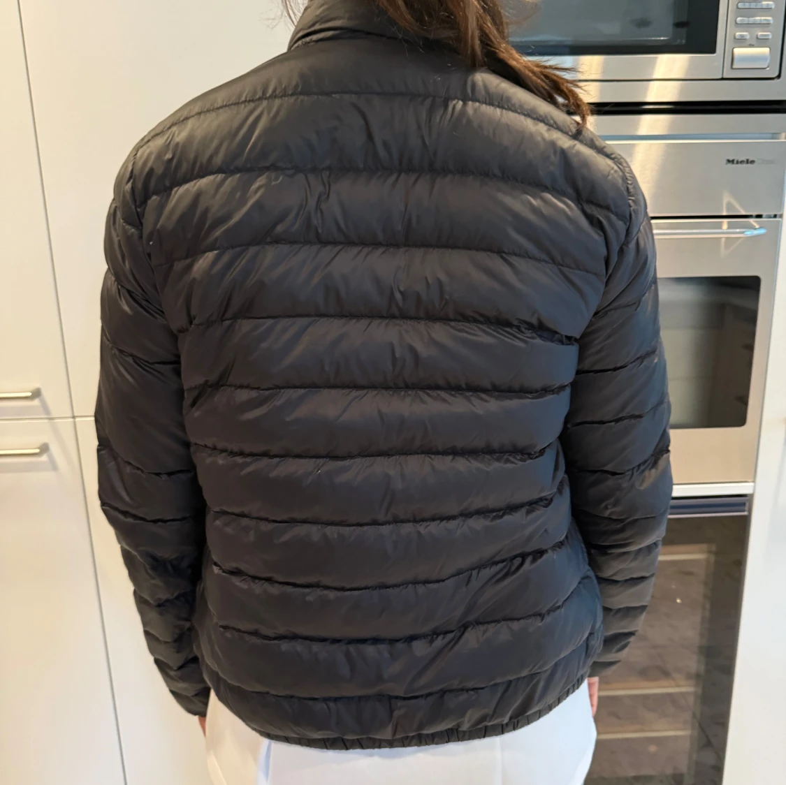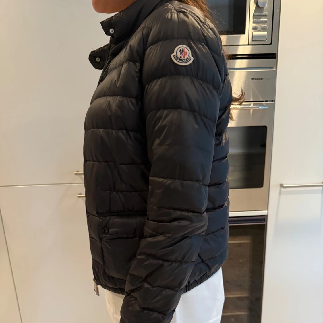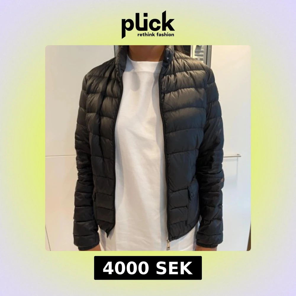 Snygg svart dunjacka från Moncler med quiltad design och hög krage. Jackan har dragkedja framtill, sidofickor med knapp och Moncler-logga på ärmen. Perfekt för dig som vill ha en stilren och varm jacka med exklusiv känsla.