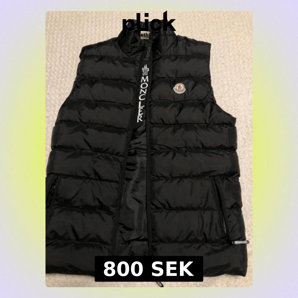 Säljer en svart pufferväst från Moncler i storlek L. Västen har hög krage, broderad Moncler-logga på bröstet och dragkedja framtill med tydlig Moncler-text. Tillverkad i blank polyester och perfekt för lager-på-lager-stil.