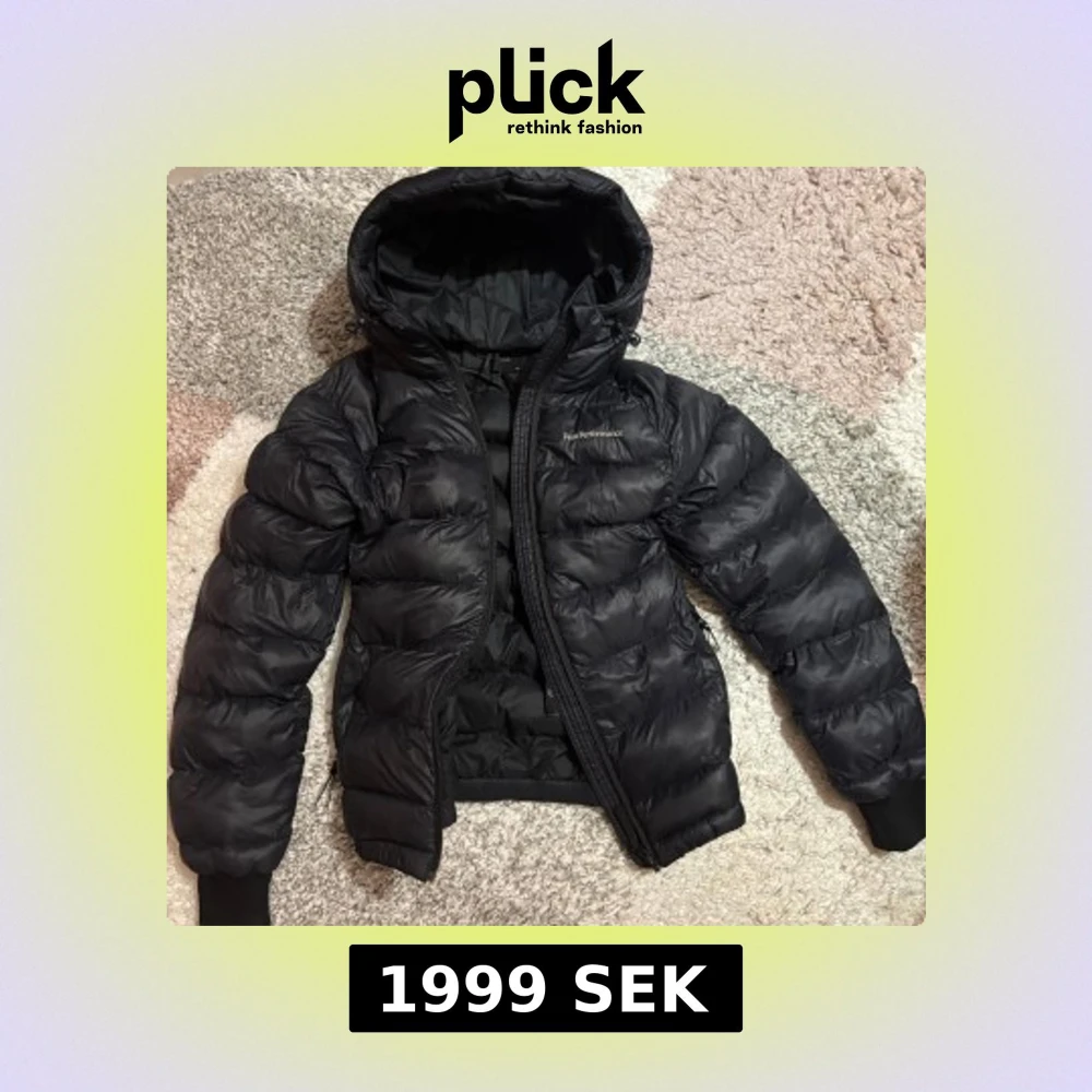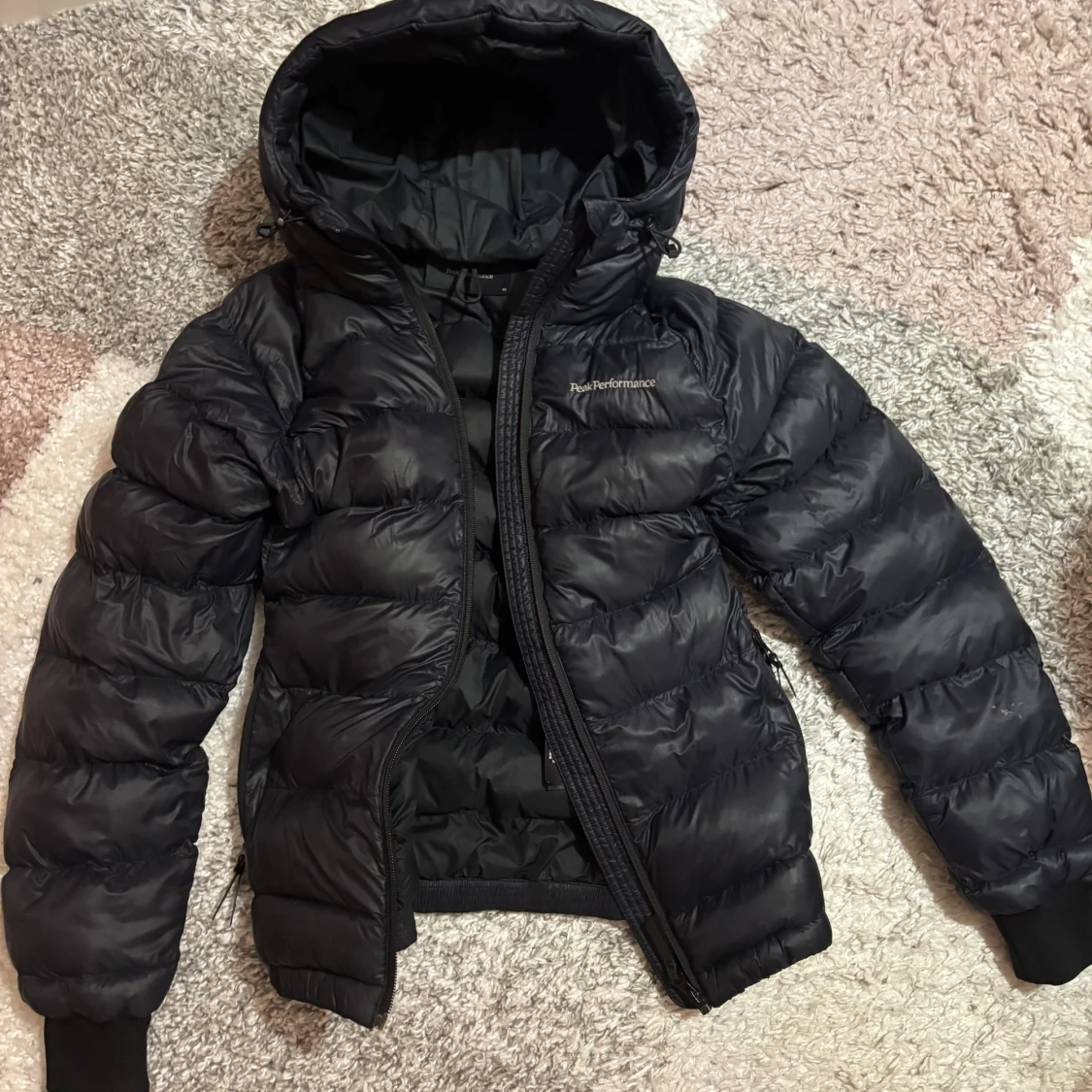 Svart dunjacka från Peak Performance med huva och dragkedja framtill. Jackan har puffad design, ribbade muddar vid ärmslut och två sidofickor med dragkedja. Perfekt för kalla dagar och har en stilren look som funkar till det mesta. Använd en vinter , som ny köpt för 3499:-