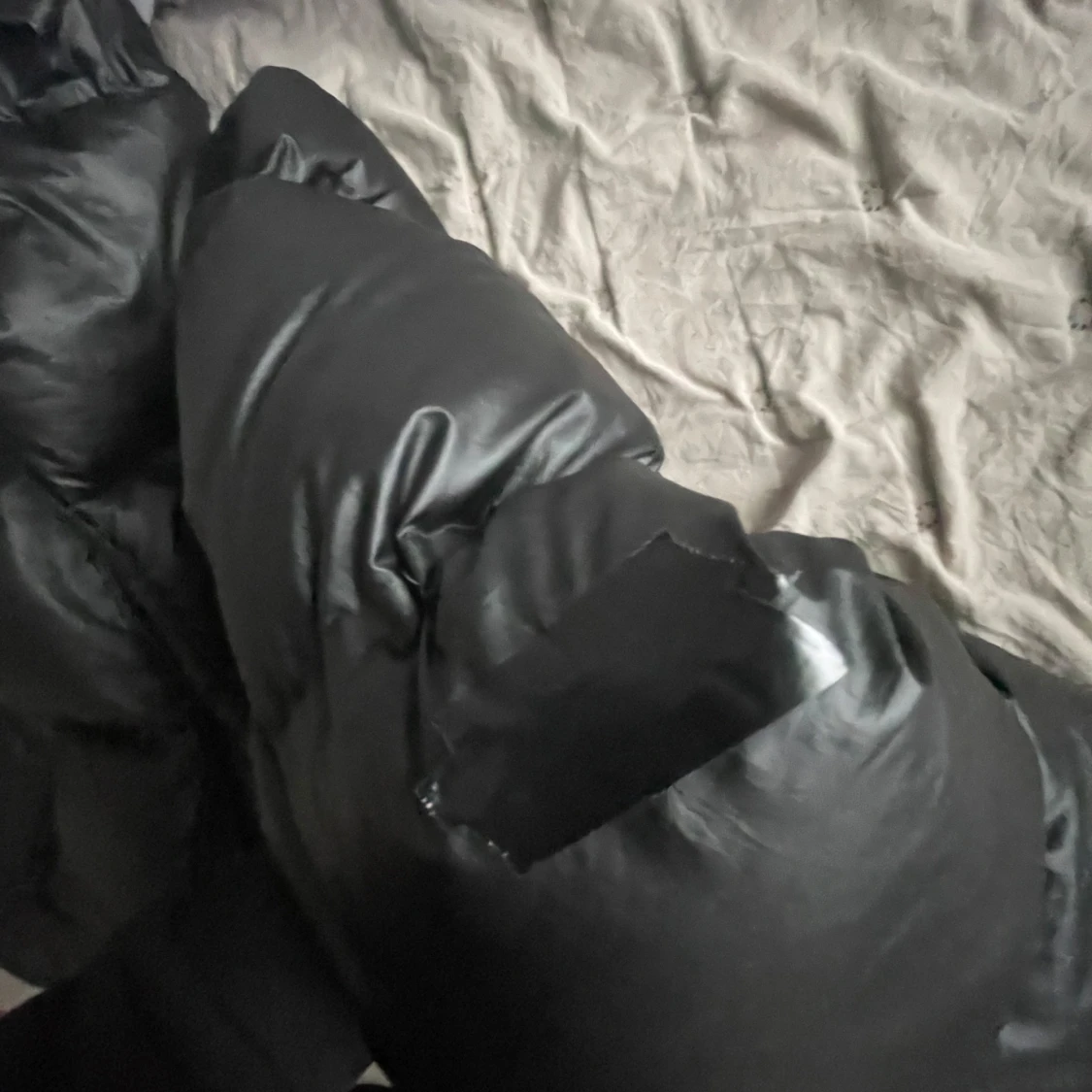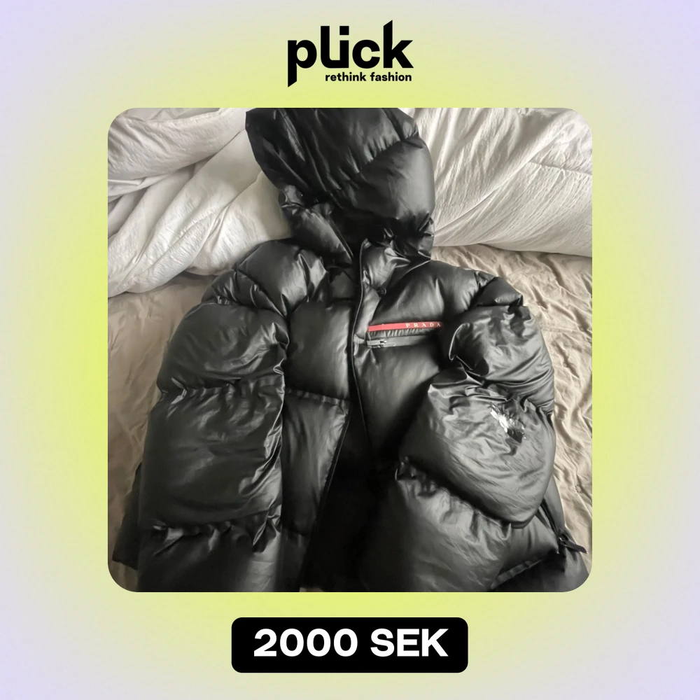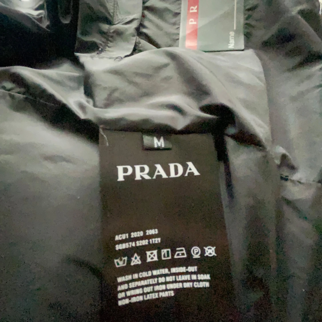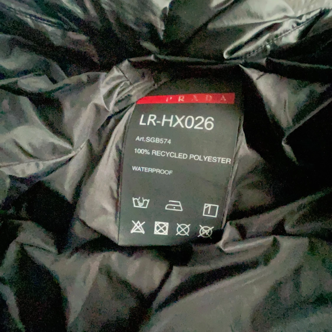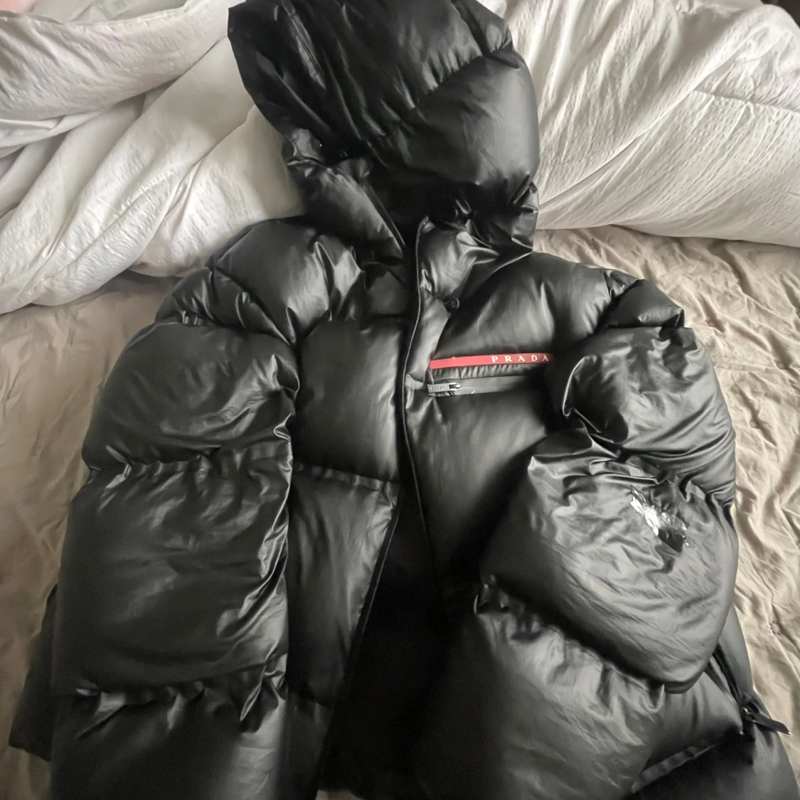 Säljer en svart pufferjacka från Prada i storlek M. Jackan är gjord av 100% återvunnen polyester och är vattentät. Den har en stor huva och dragkedja framtill. Perfekt för kalla vinterdagar! Notera att det finns en liten reva på ena ärmen.