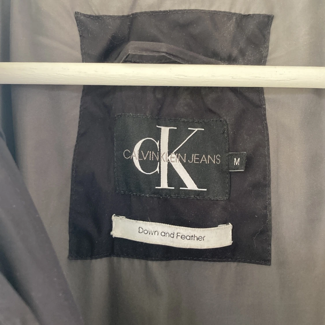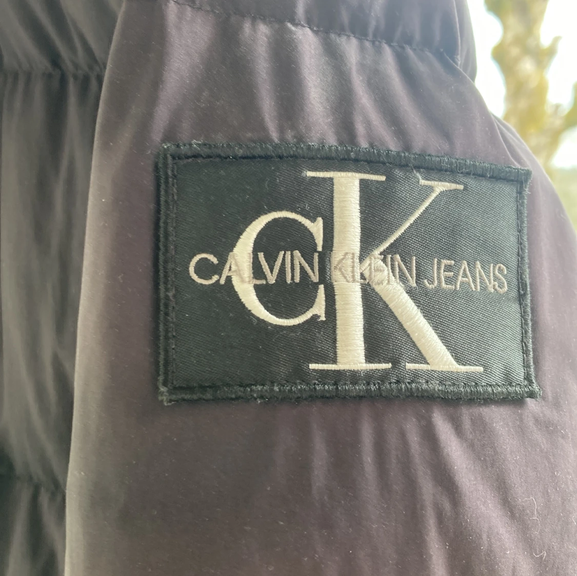 Säljer en svart pufferjacka från Calvin Klein med dragkedja och broderad logga på ärmen. Jackan är perfekt för kyligare väder och har en stilren design. Den är tillverkad av dun och fjäder för extra värme. Använd men inte skadad på något sätt.
