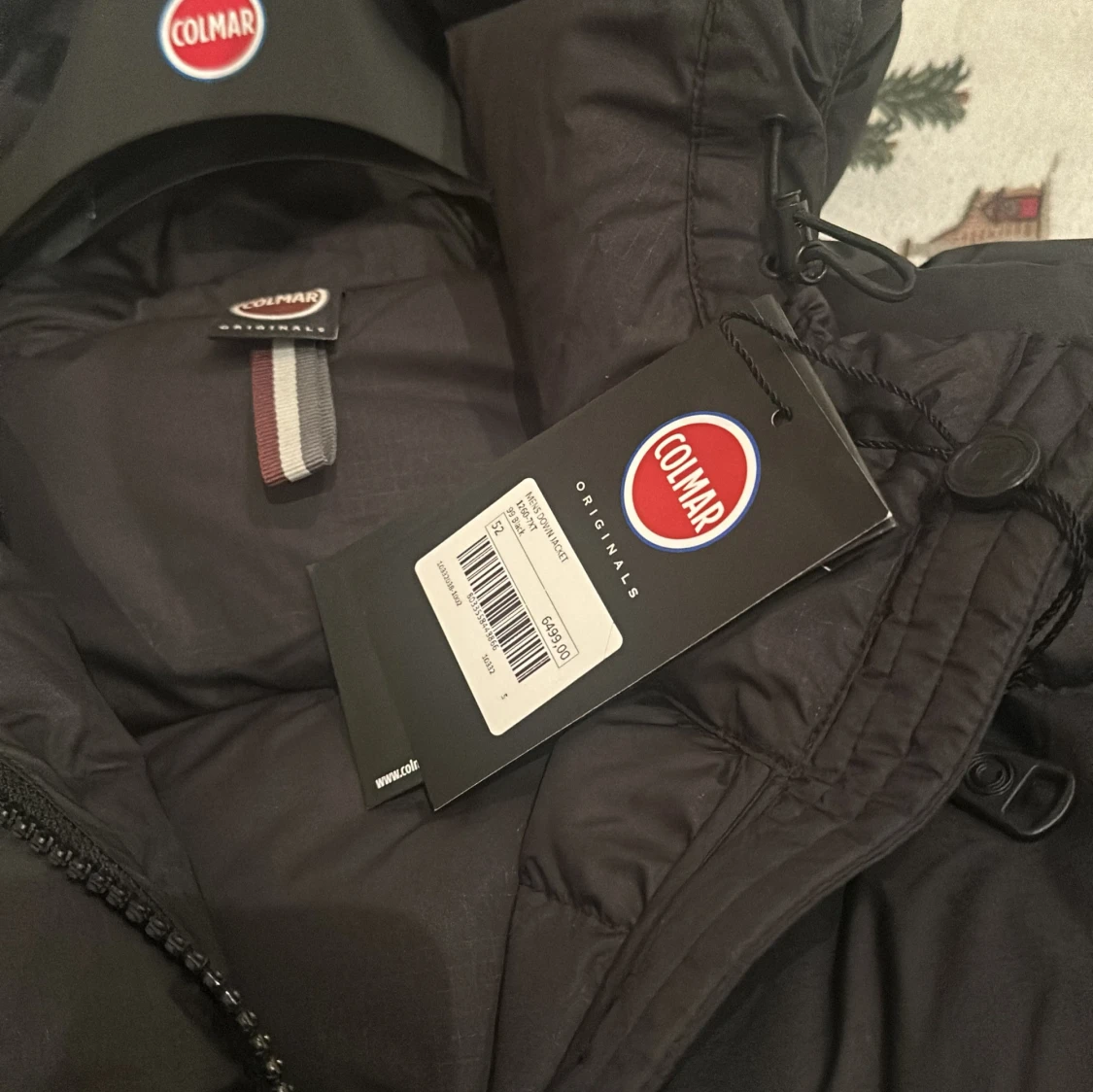 Säljer en svart pufferjacka från Colmar med dragkedja och huva. Jackan är perfekt för kalla dagar och har en stilren design med långa ärmar. Den är quiltad för extra värme och komfort.Helt ny med prislapp på.