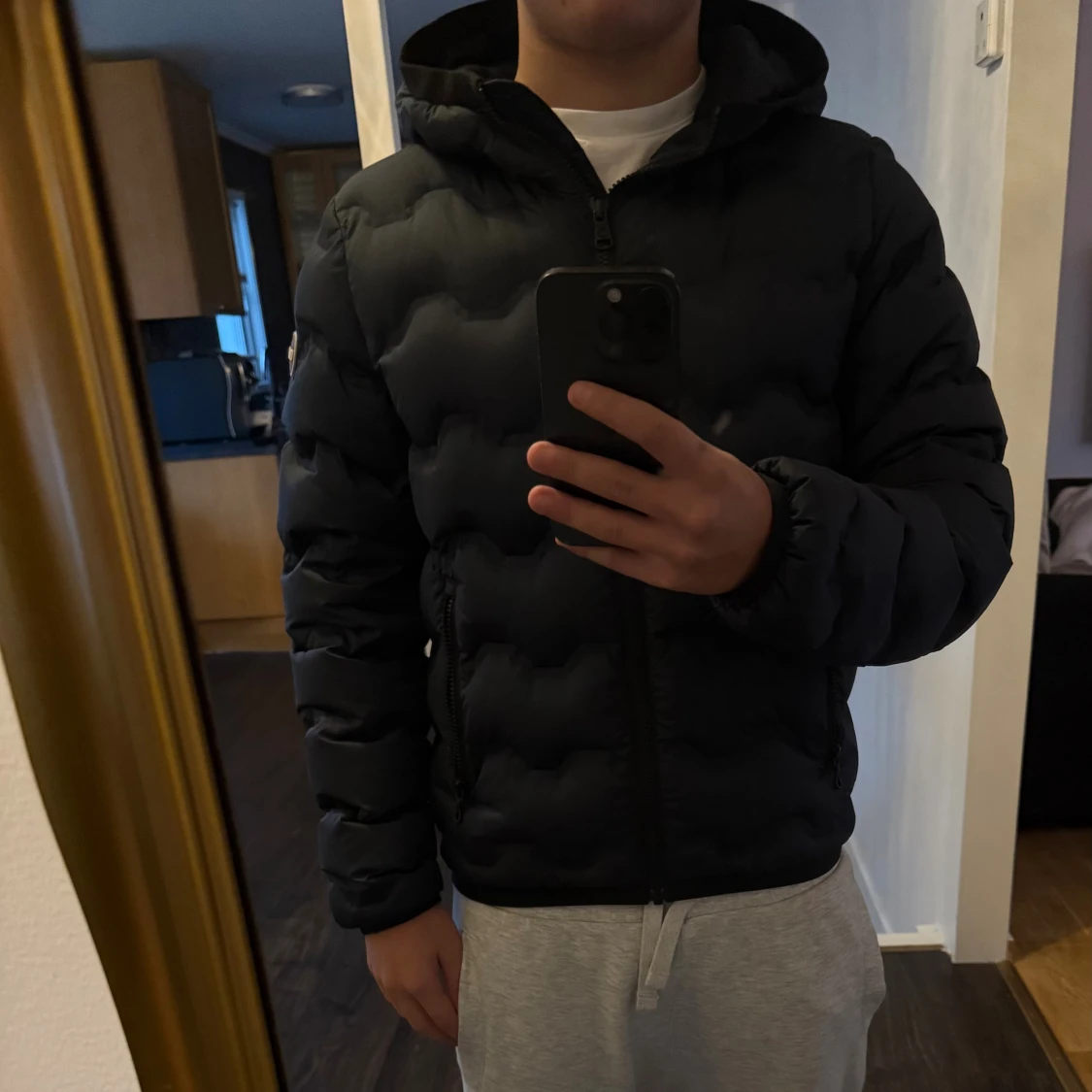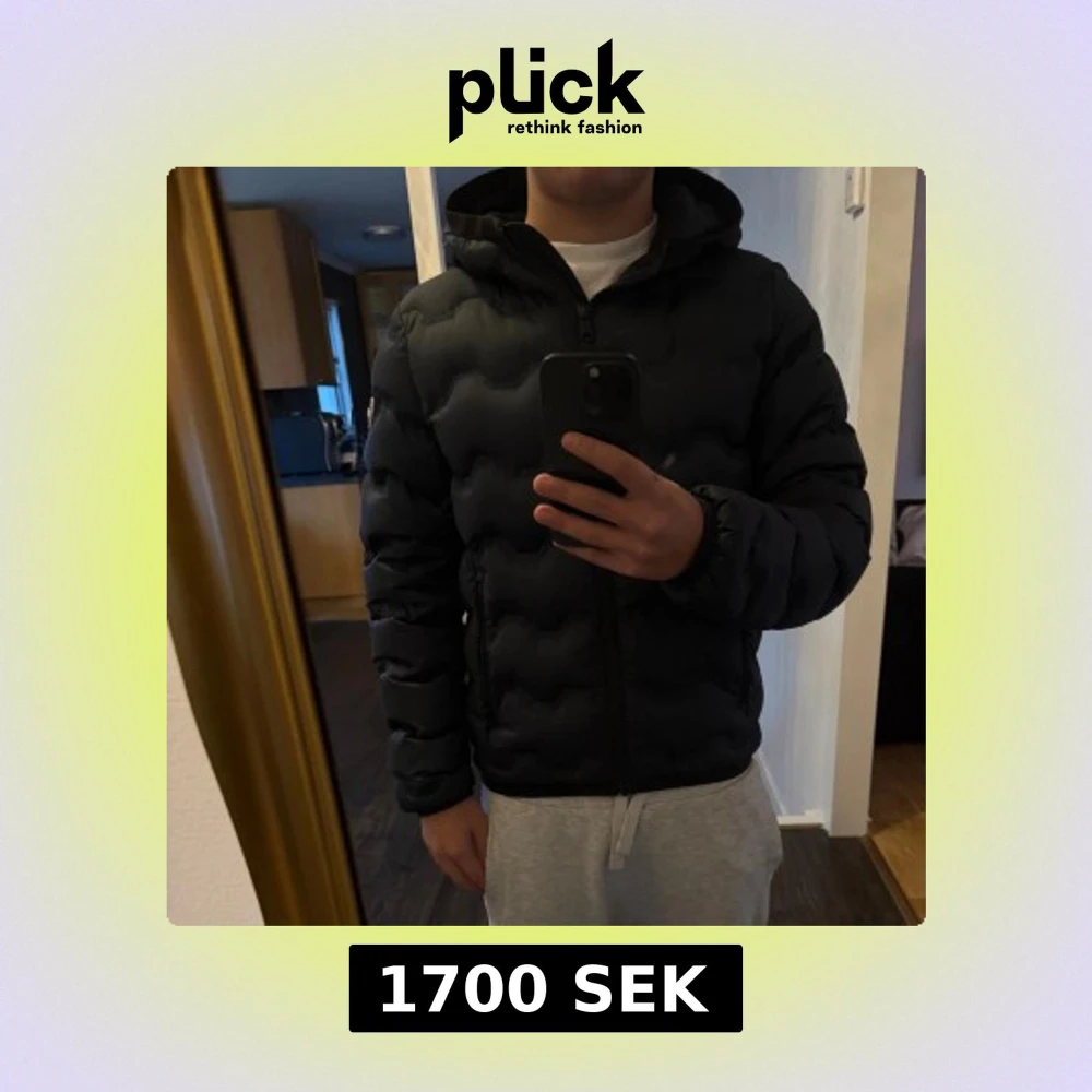 Säljer en svart pufferjacka från Colmar med huva och snyggt vågformat quiltat mönster. Jackan har dragkedja framtill och två sidofickor med dragkedja. Perfekt för dig som vill ha en stilren och varm jacka med modern look.