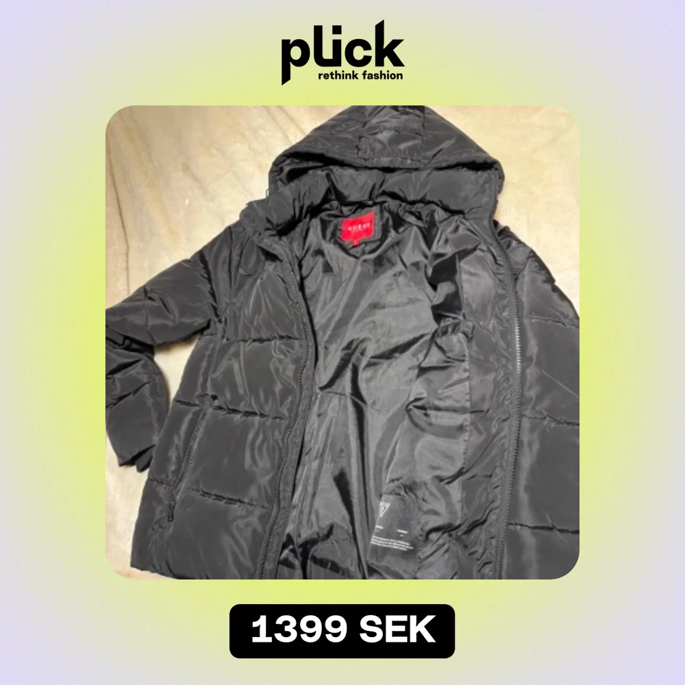 Säljer en snygg svart pufferjacka från Guess. Jackan har en stilren design med Guess-loggan diskret på bröstet och en huva för extra värme. Den är perfekt för kyliga dagar och har en dragkedja framtill. Jag köpte den för ca 2500kr. helt felfri