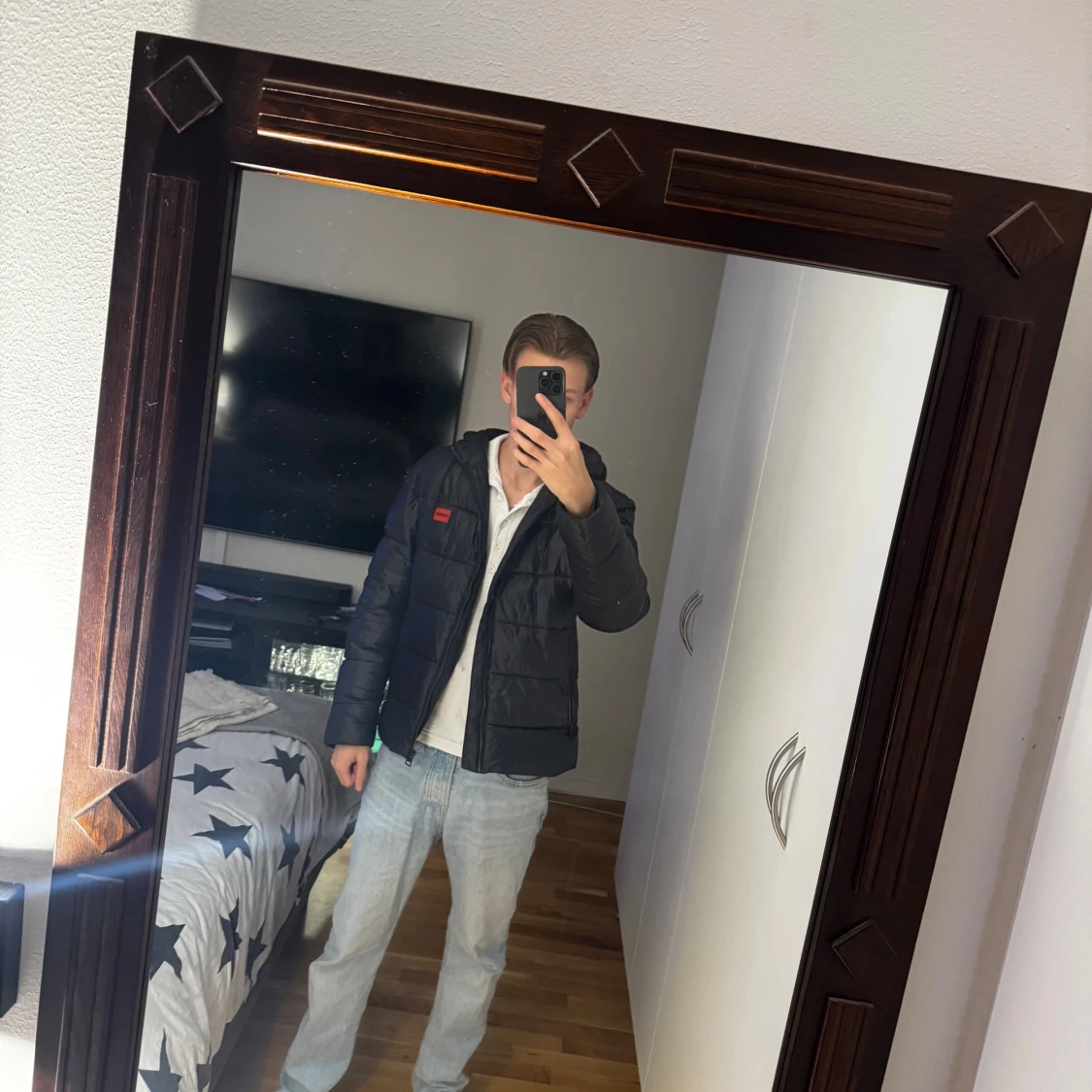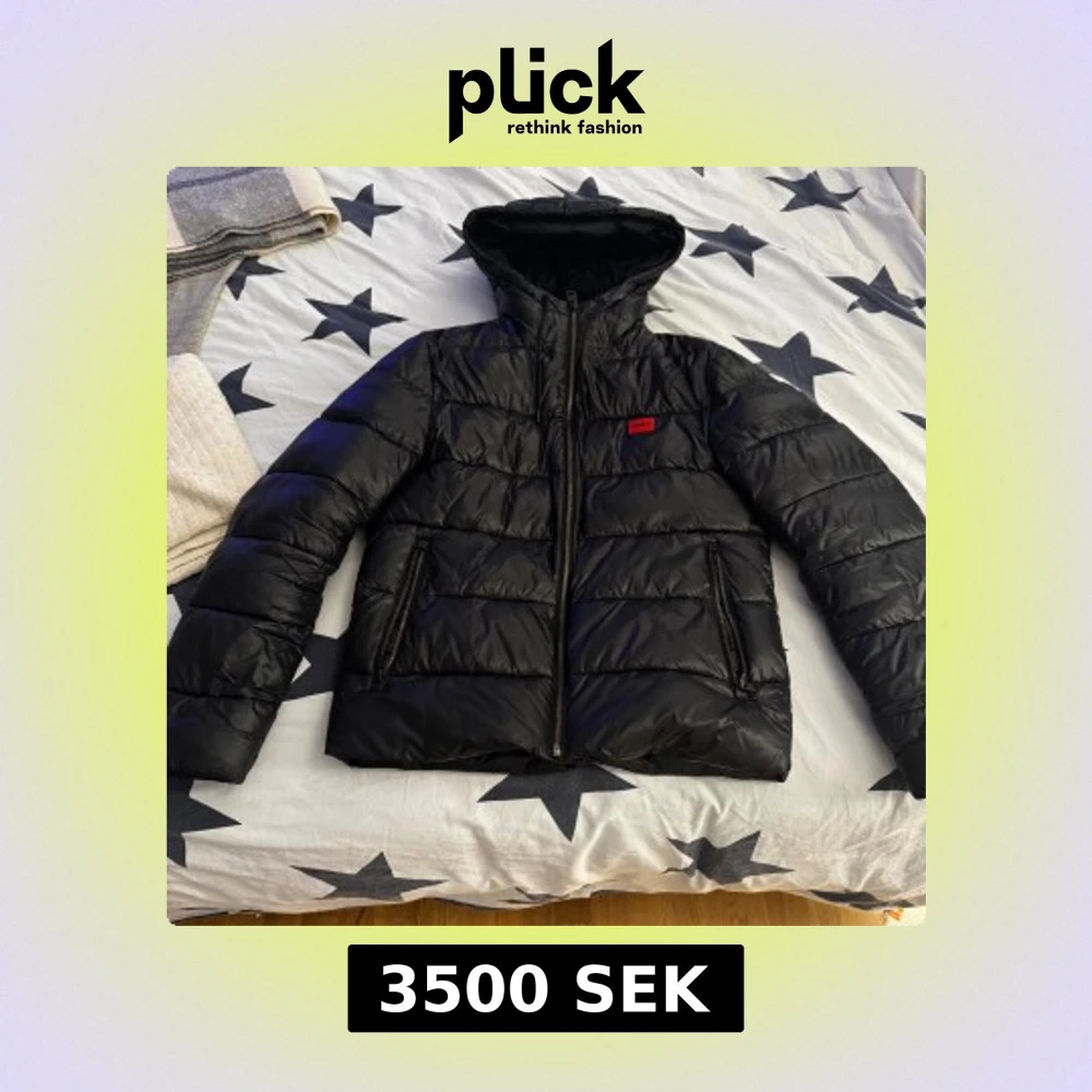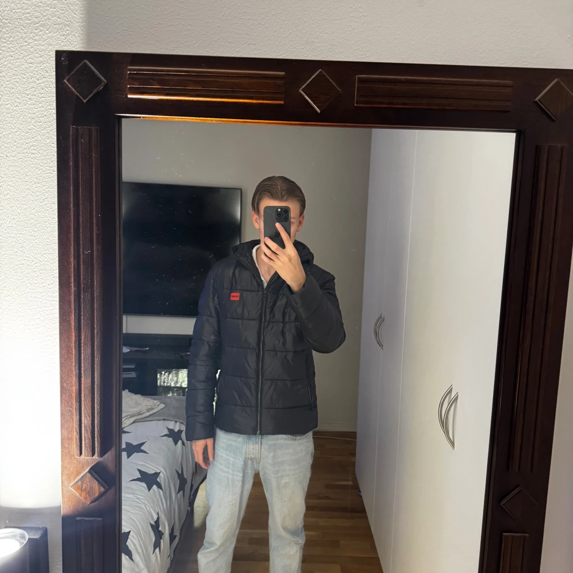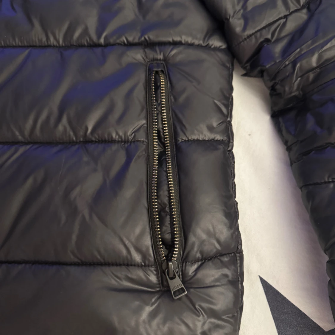 Svart pufferjacka från Hugo med huva och rödmärkt logga på bröstet. Jackan har två fickor med dragkedja, quiltad design och hel dragkedja framtill. Perfekt för kalla dagar och riktigt snygg till jeans.