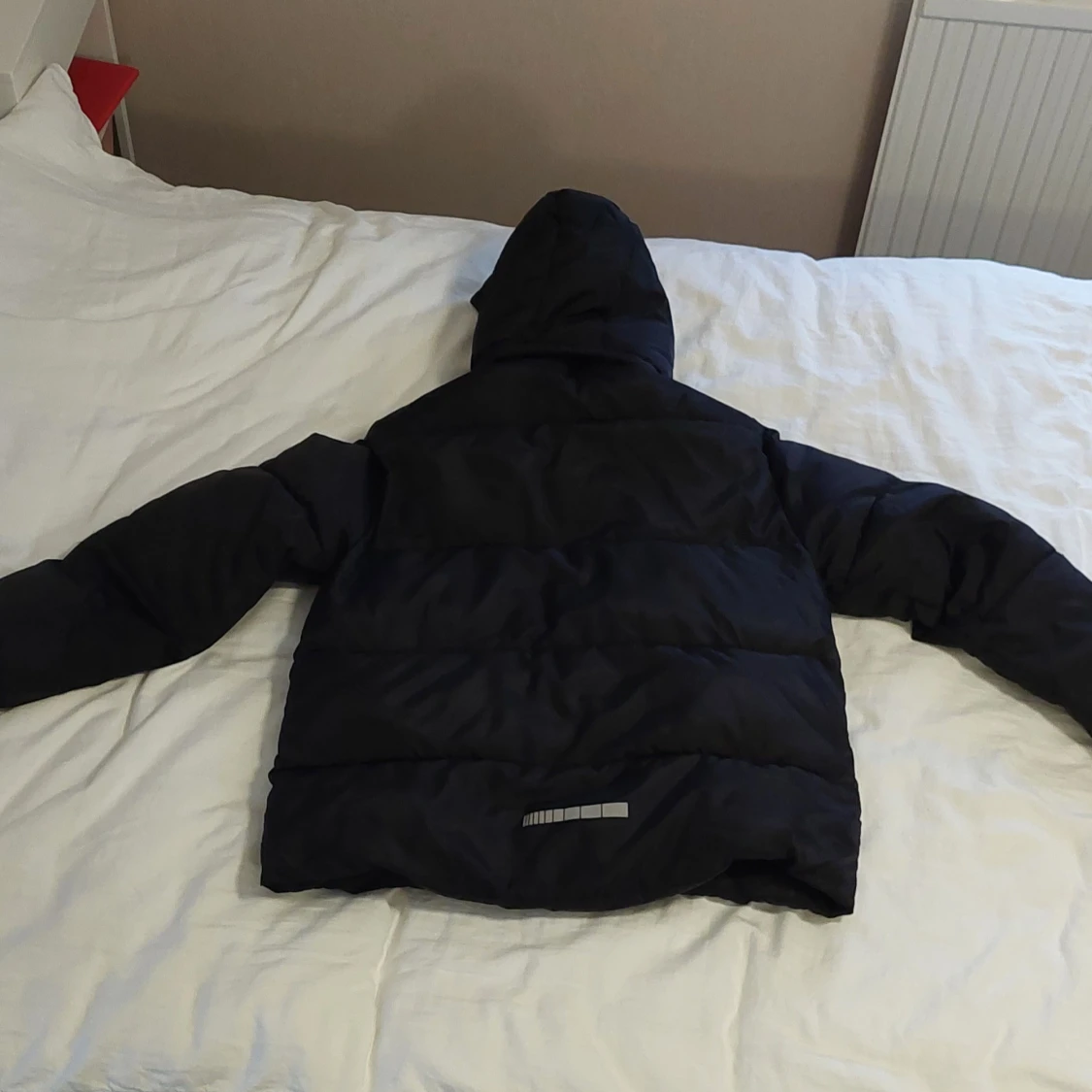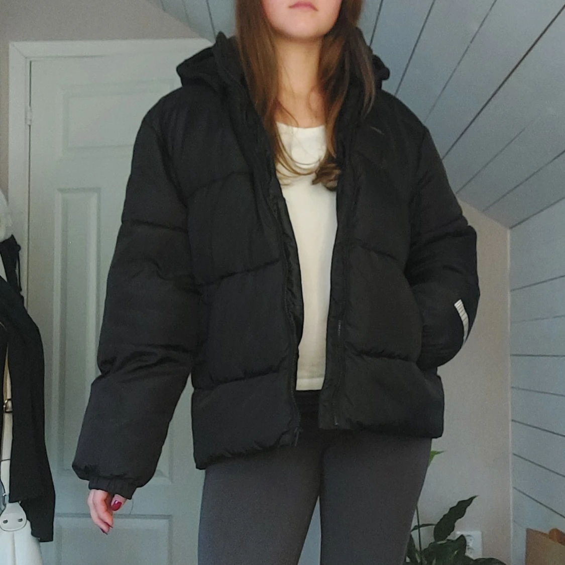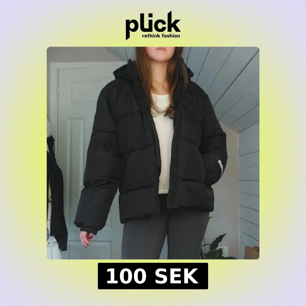 Säljer en svart pufferjacka från Lindex i storlek 170. Jackan har huva, dragkedja och är tillverkad i återvunnen polyester. Lite för stor för mig som brukar ha xs-s