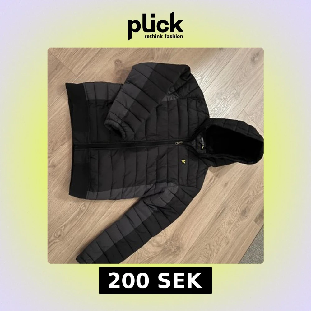 Säljer en svart pufferjacka från Lyle & Scott med dragkedja och en gul logotyp på bröstet. Jackan har långa ärmar och är perfekt för kyligare väder. Den är designad i Storbritannien och passar ungdomar i åldern 14-15 år.