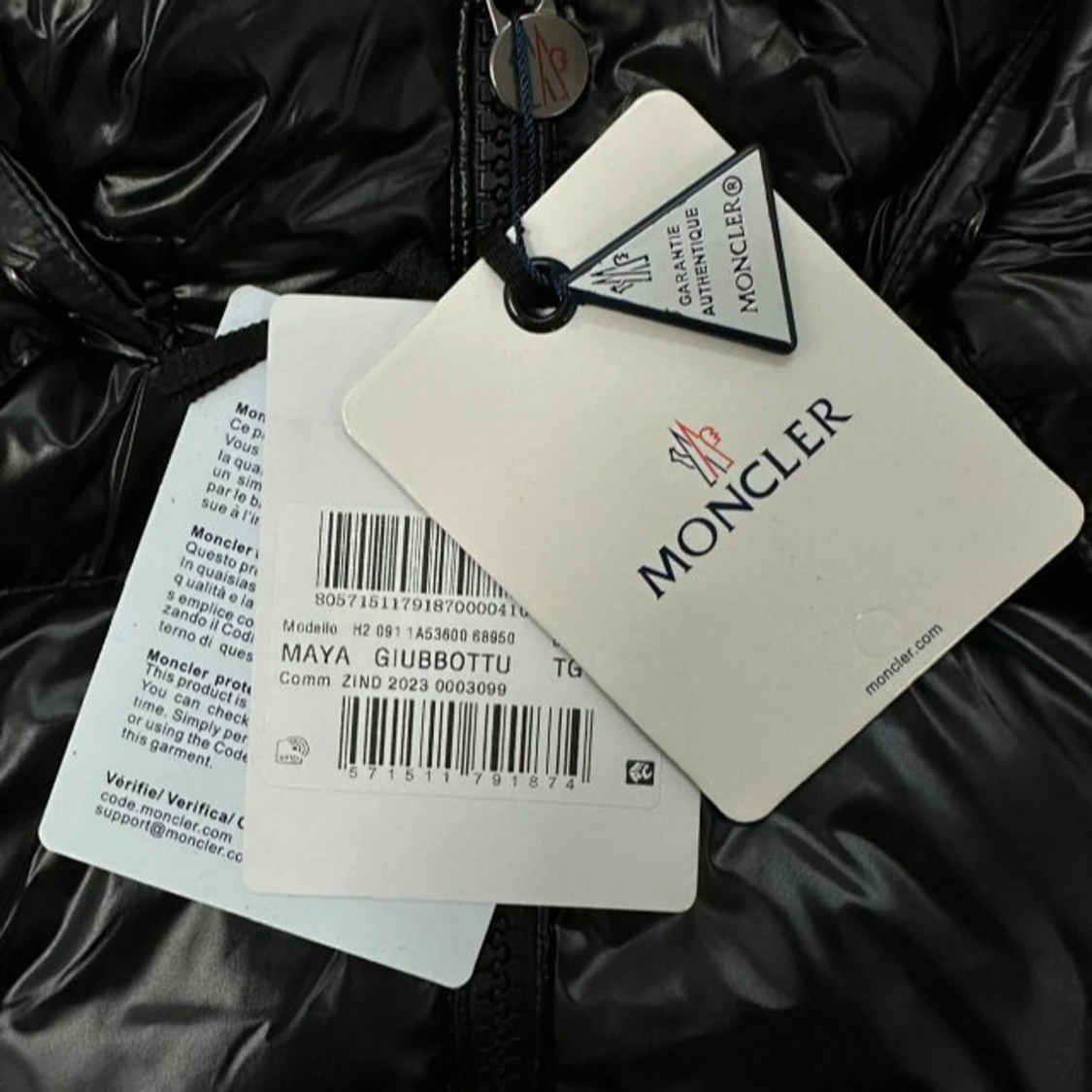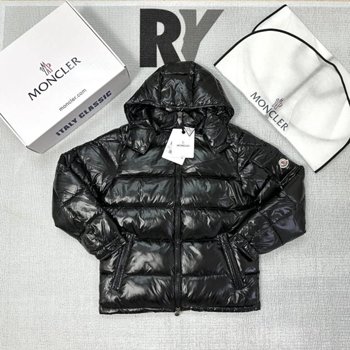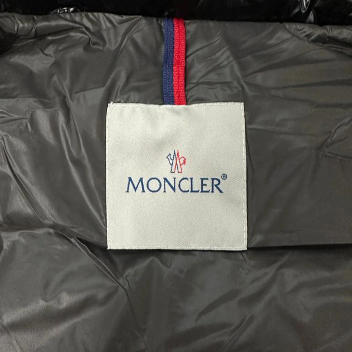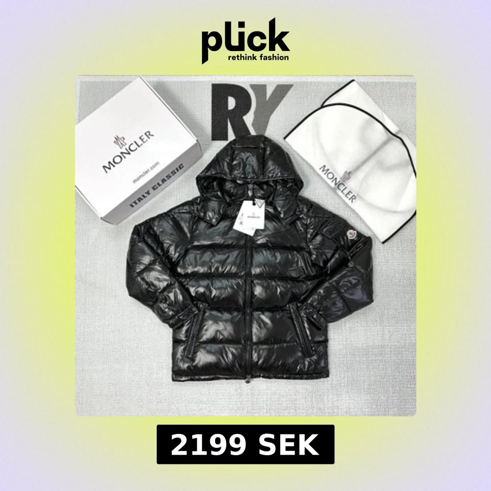 Svart pufferjacka från Moncler med glansig finish och huva. Jackan har dragkedja framtill, två sidofickor med dragkedja och Moncler-logga på ärmen. Materialet är syntet och dun, perfekt för kalla dagar. Snygg och stilren design som sticker ut.