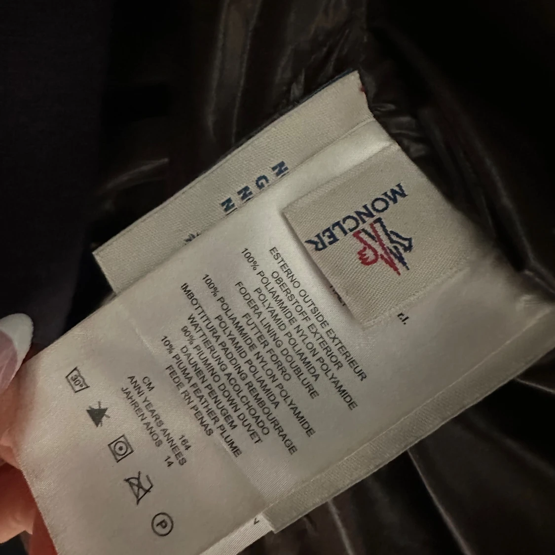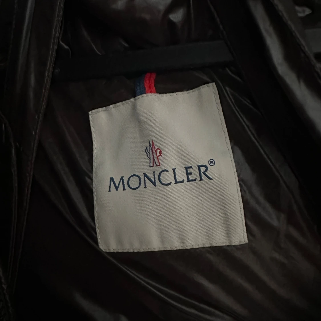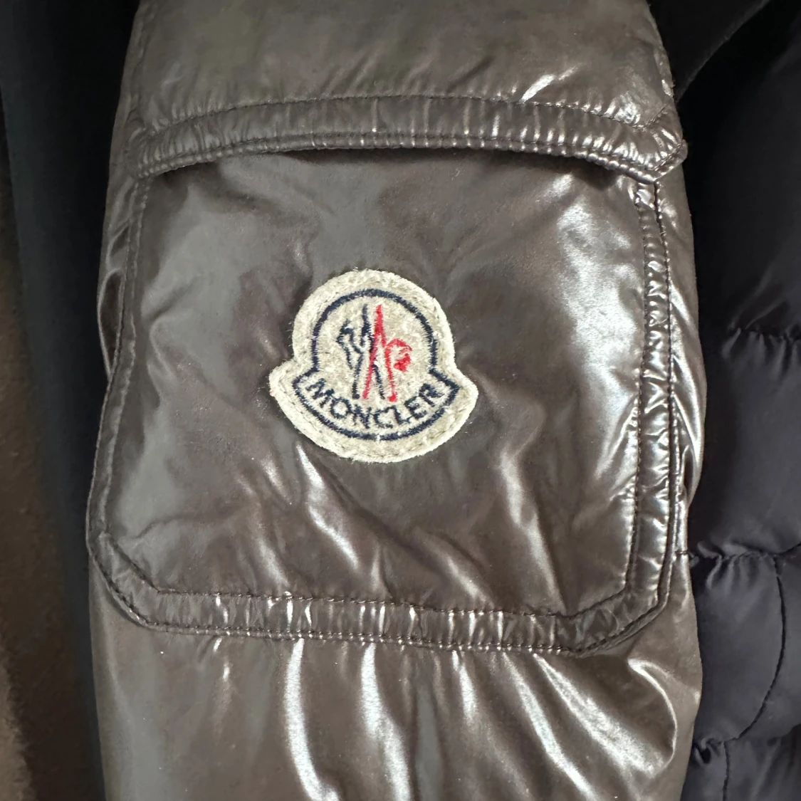 Säljer en svart, glansig pufferjacka från Moncler med stor huva och klassisk logga på ärmen. Jackan har långa ärmar, flera fickor och en riktigt fet dunfyllning som håller dig varm under kalla dagar. Perfekt för dig som vill ha en snygg och lyxig vinterjacka.