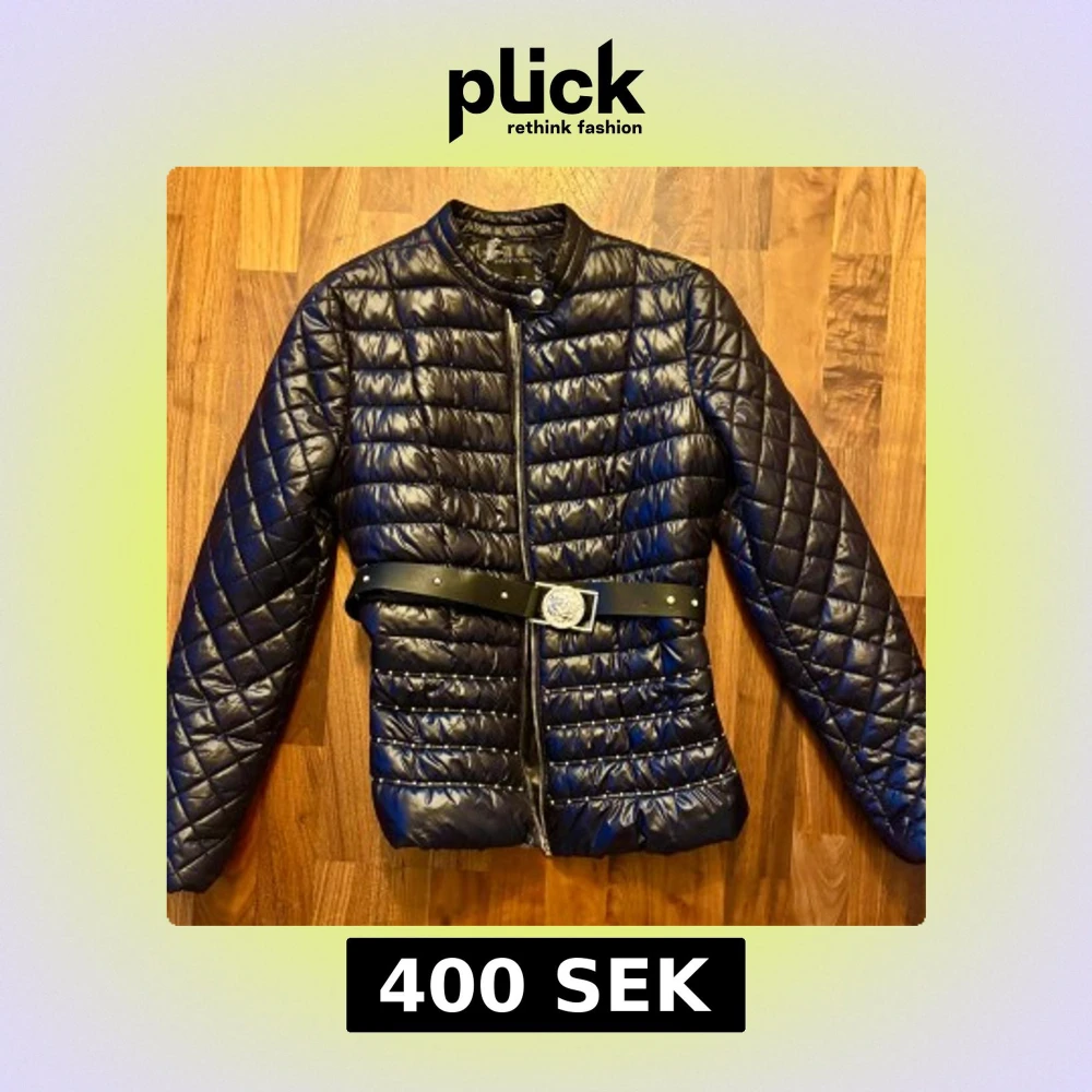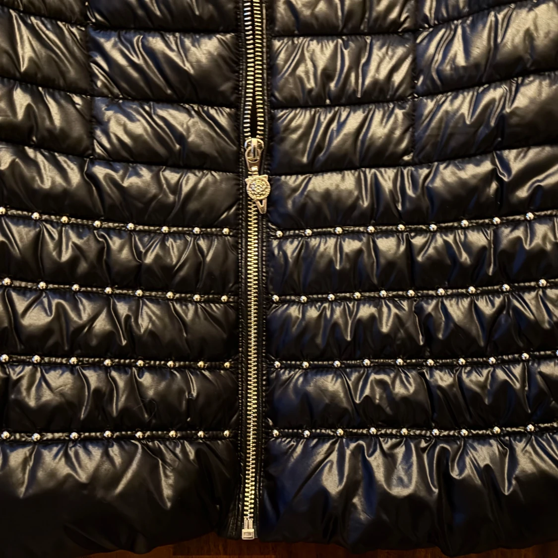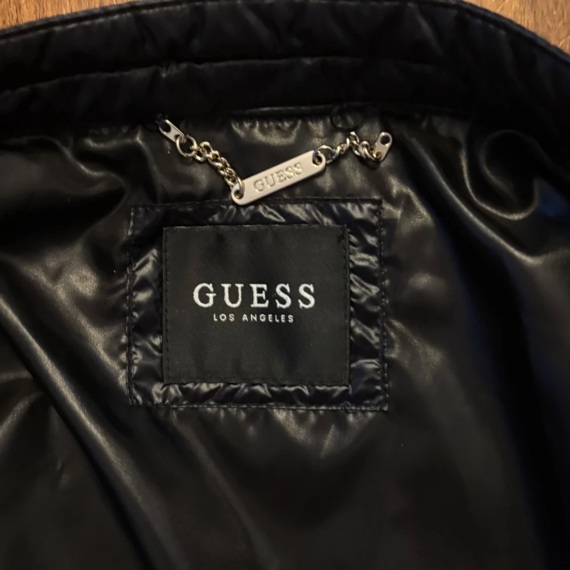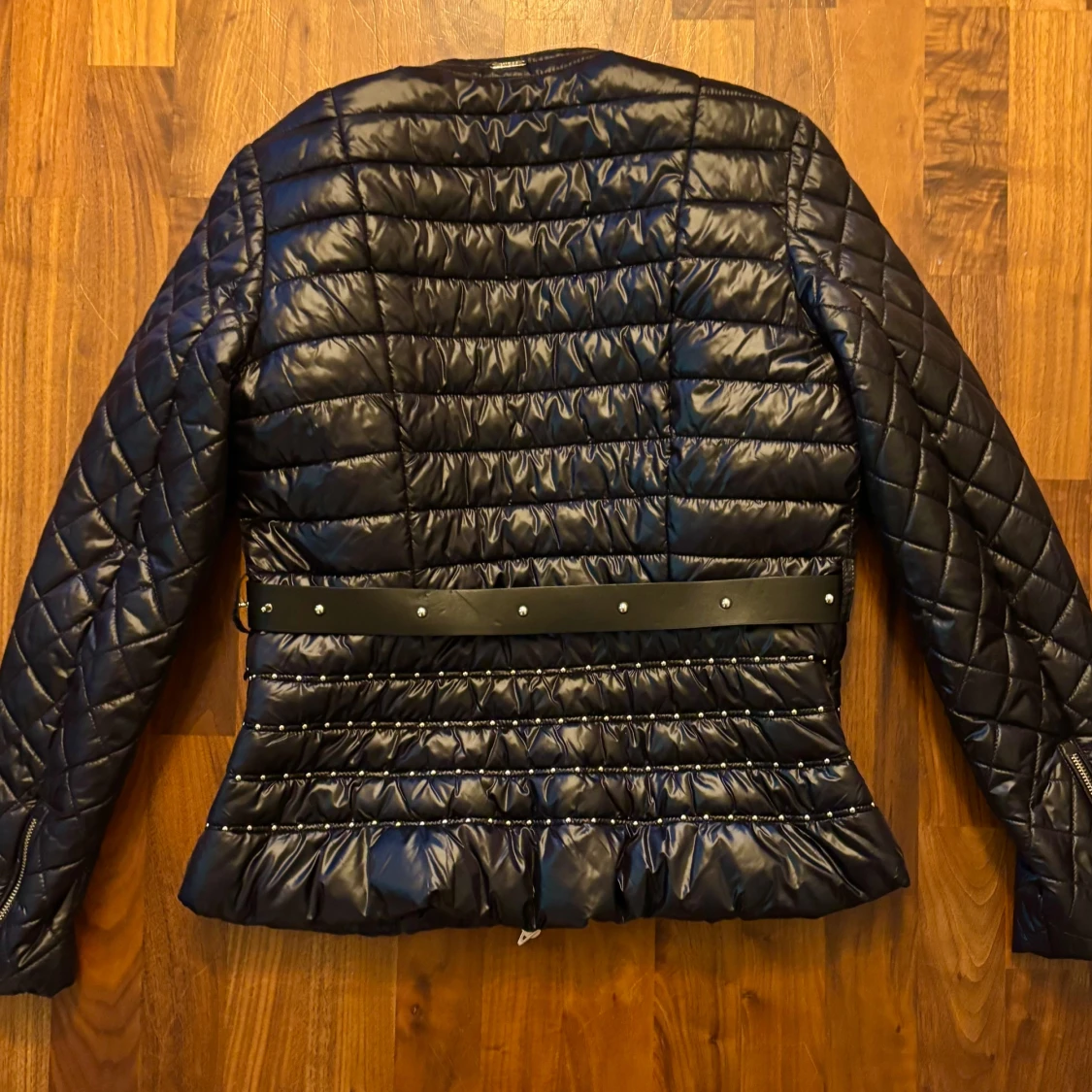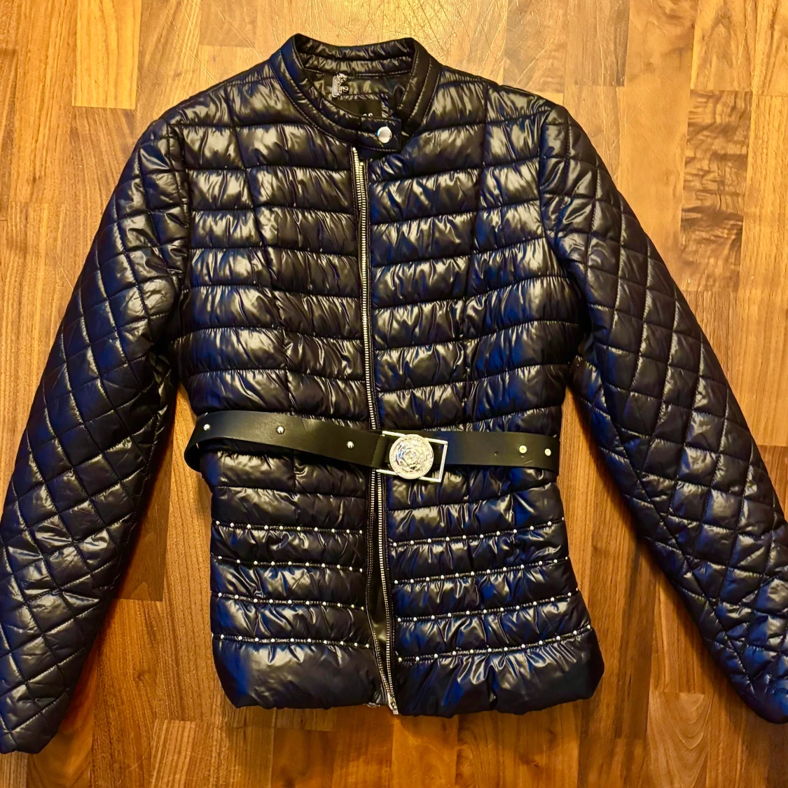 Snygg svart pufferjacka från Guess med quiltat mönster och markerad midja med bälte och silverdetaljer. Jackan har dragkedja framtill med dekorativt hjärthänge och små nitar längs sömmarna. Perfekt för dig som vill ha en stilren och trendig look.