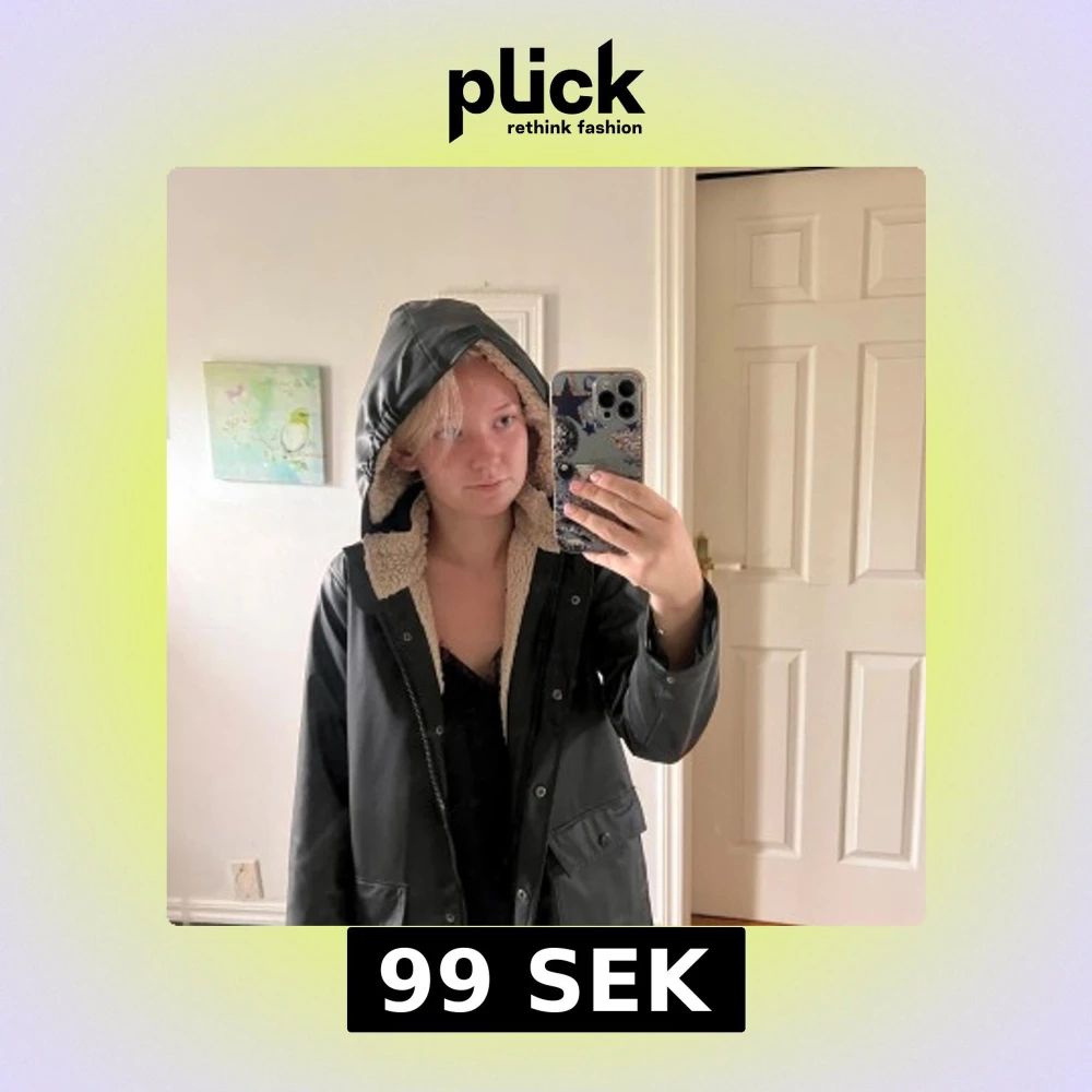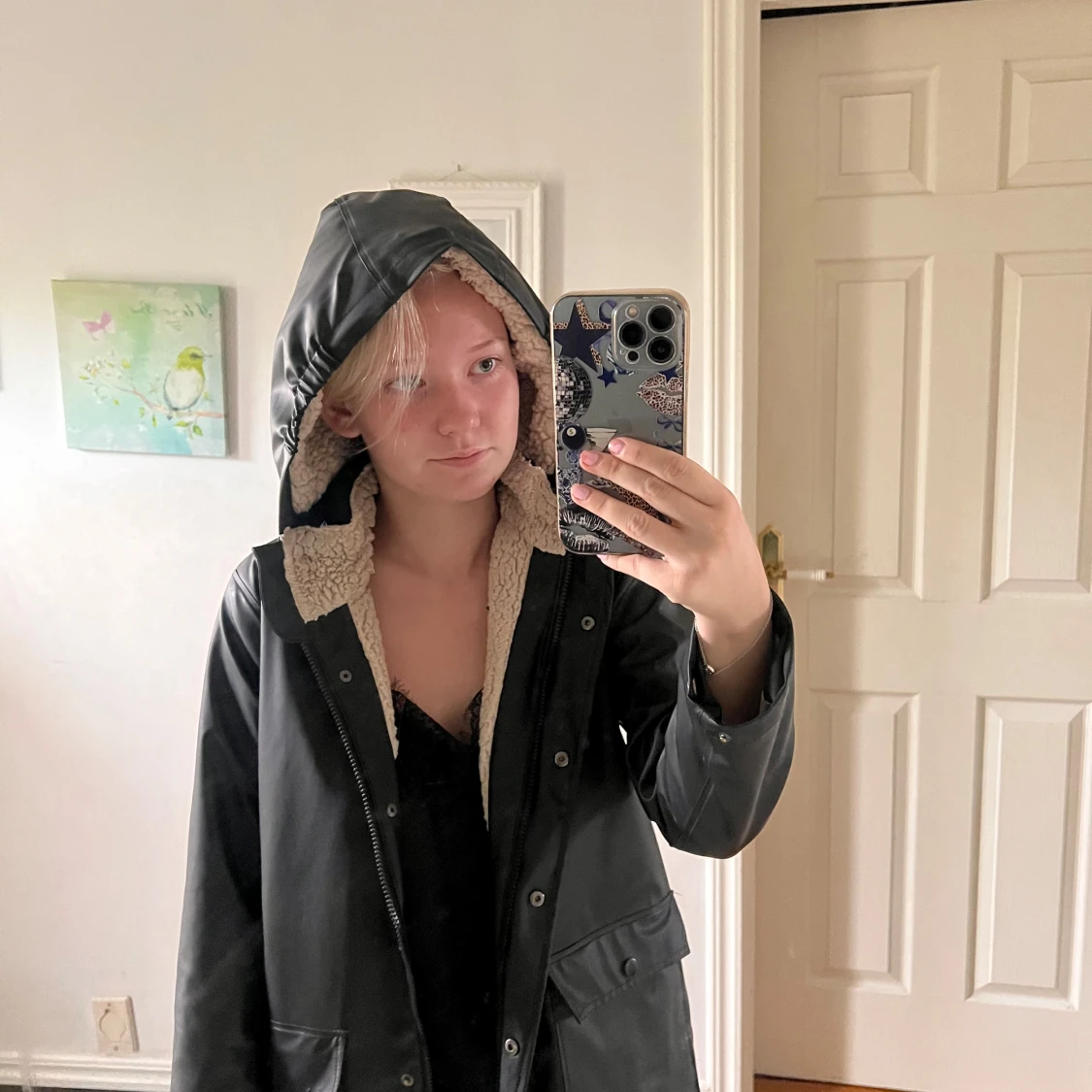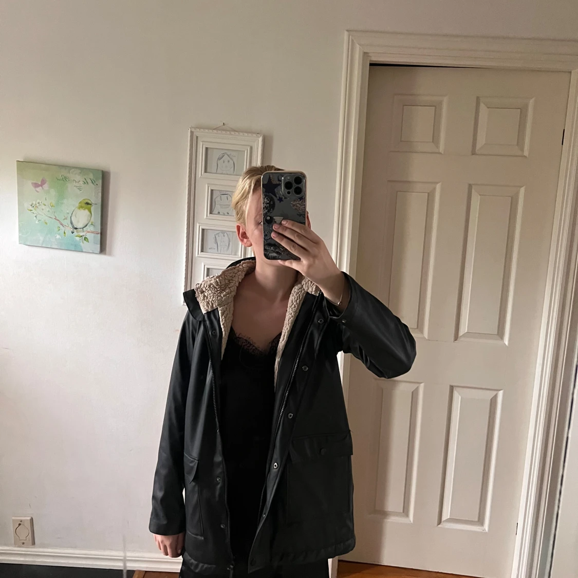 Svart regnjacka med mysigt beige teddyfoder och huva. Jackan har stora fickor framtill, dragkedja och tryckknappar. Perfekt för ruggiga dagar när du vill hålla dig både torr och varm. Snygg och enkel design som funkar till det mesta. Den är förstås lite liten på mig (jag är 158cm och 18 år)