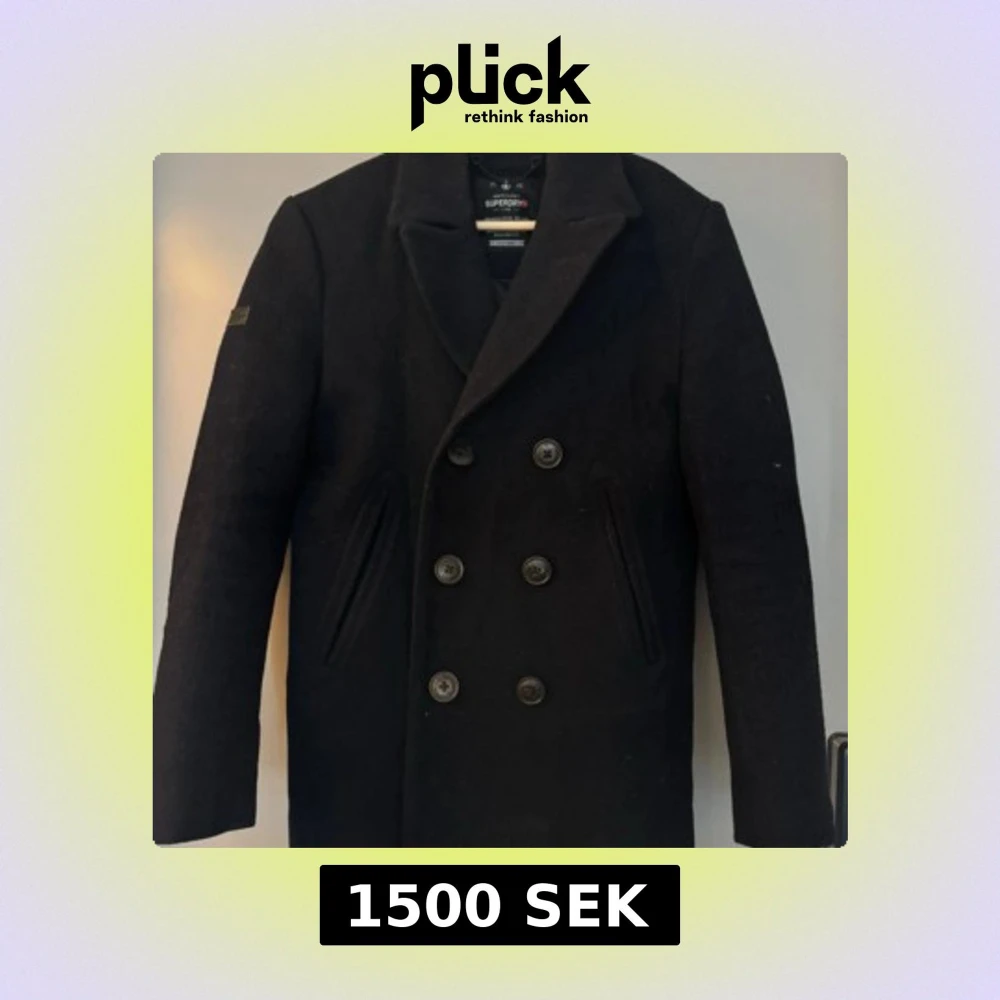 Stilren svart skepparkavaj från Superdry med dubbelknäppning och bred krage. Jackan har långa ärmar, två snedställda fickor fram och är helfodrad med diskreta röda detaljer på insidan. Perfekt för en klassisk look.