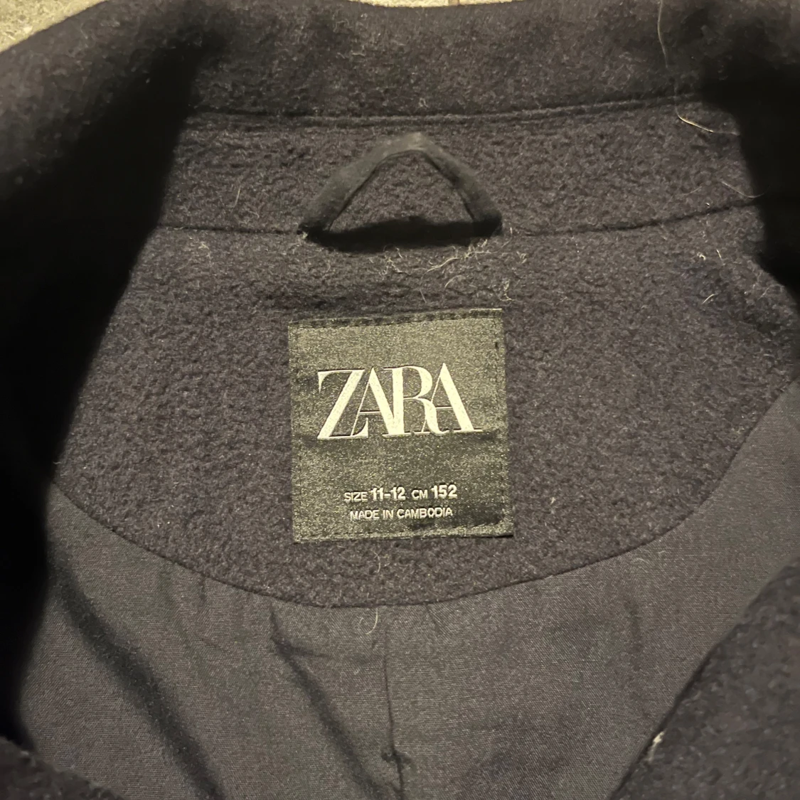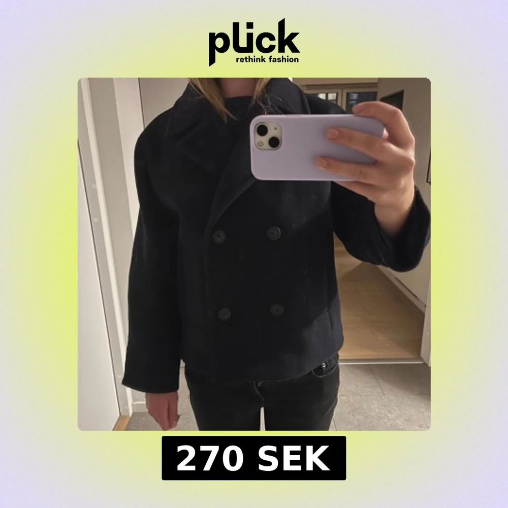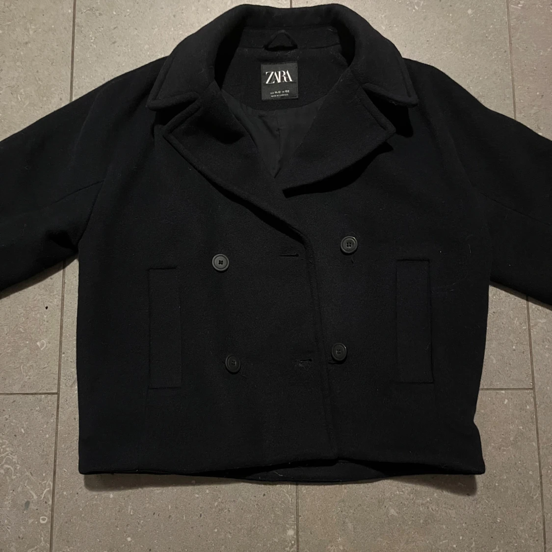 Säljer en svart skepparkavaj från Zara med dubbelknäppning och bred krage. Jackan är i ullblandning, har raka ärmar och två fickor framtill. Perfekt för dig som gillar en klassisk och stilren look med lite boxig passform.