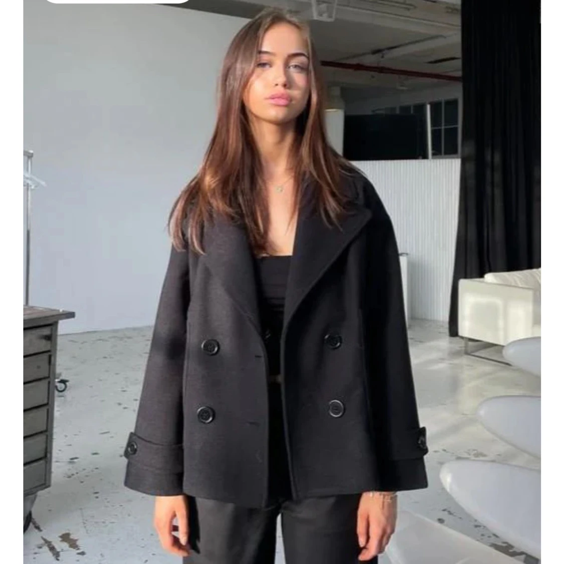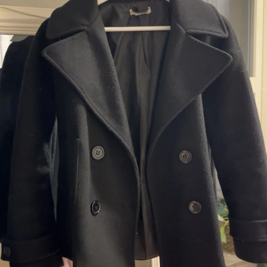 Säljer en svart skepparkavaj med bred krage och dubbelknäppning framtill från DesignBySi Använd men är fortfarande i bra skick💕Storlek Xs/S