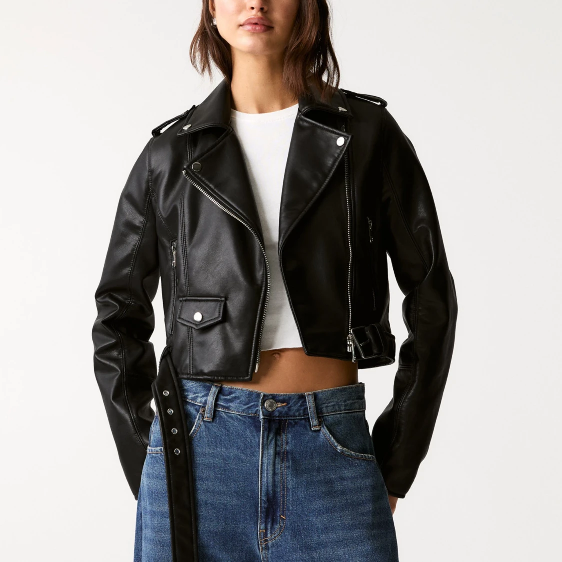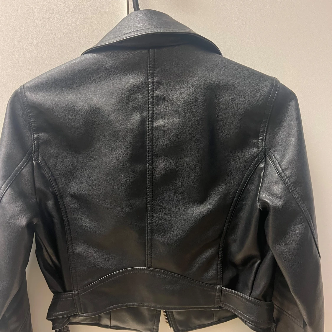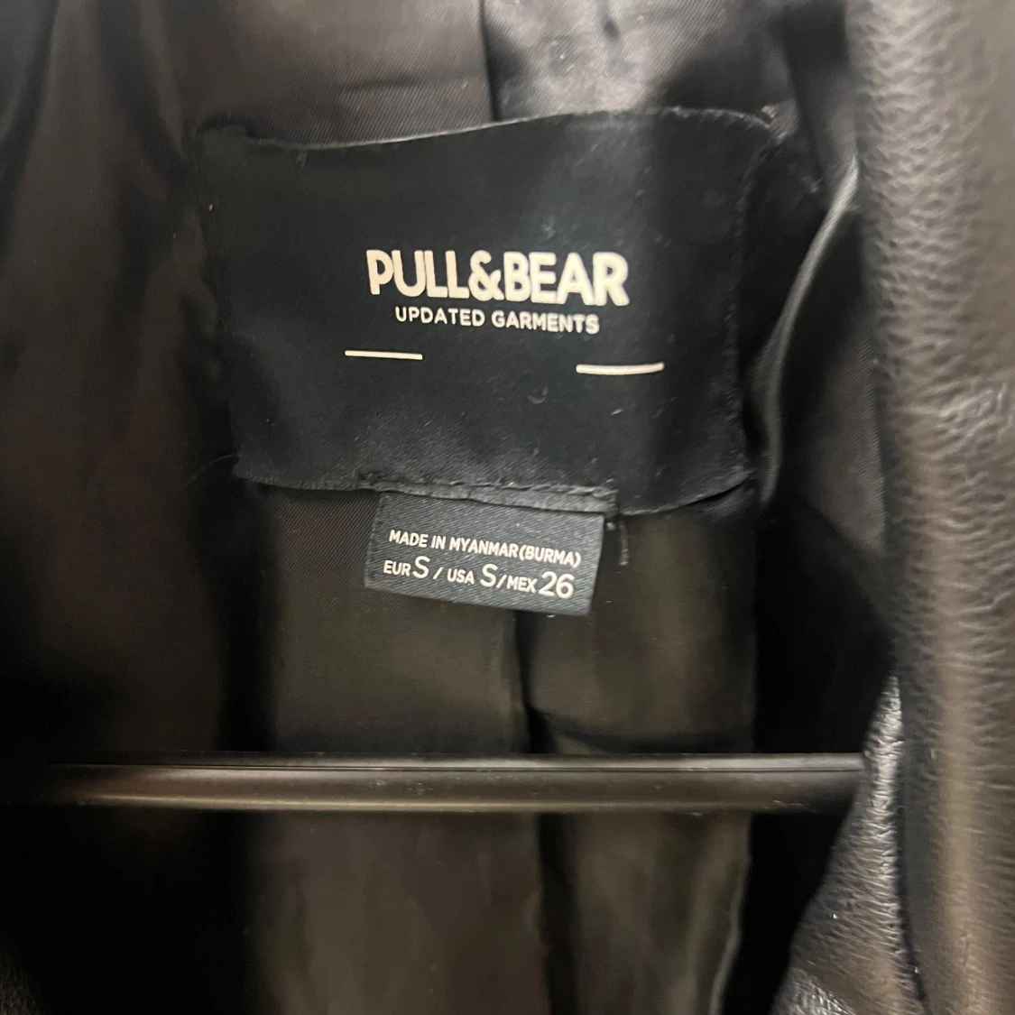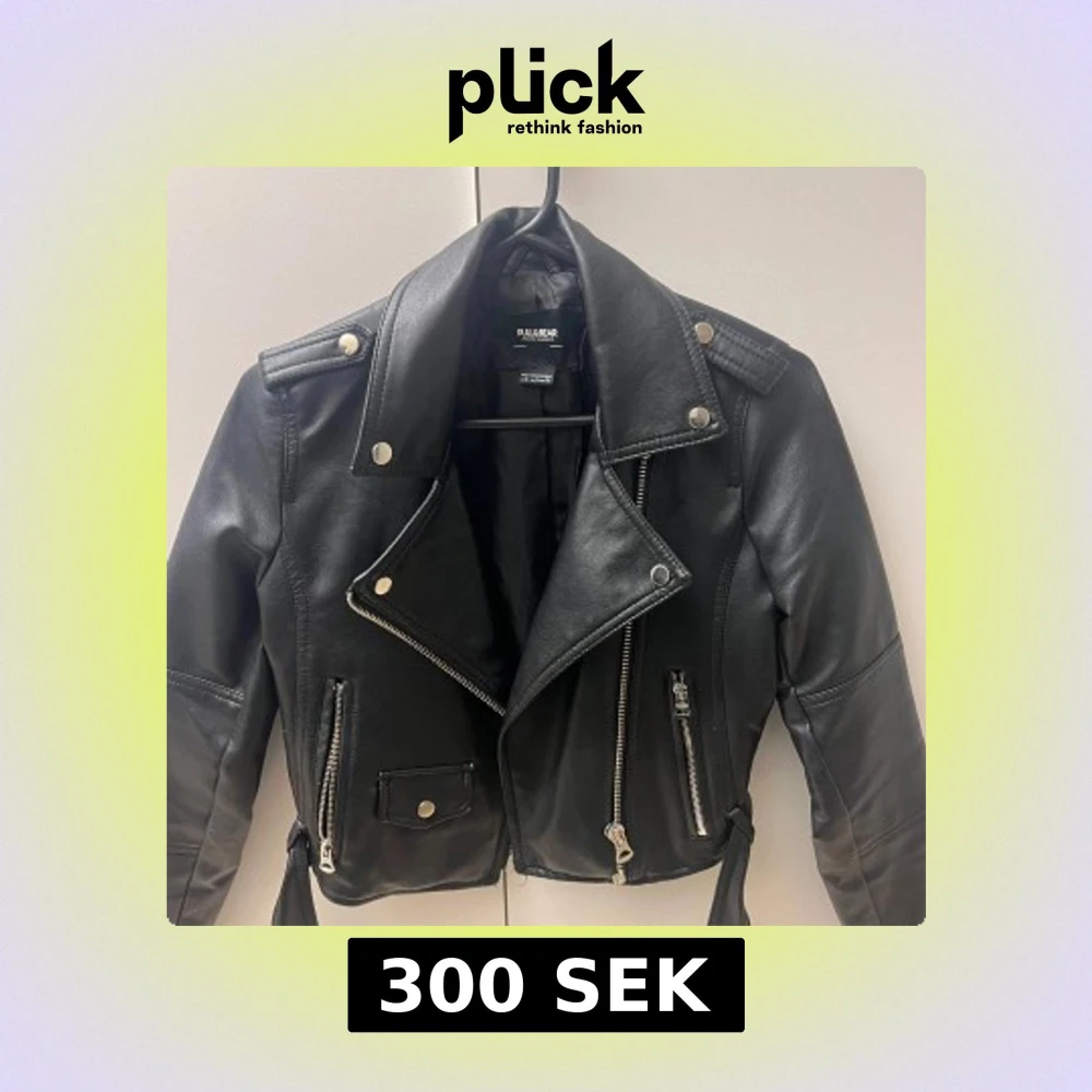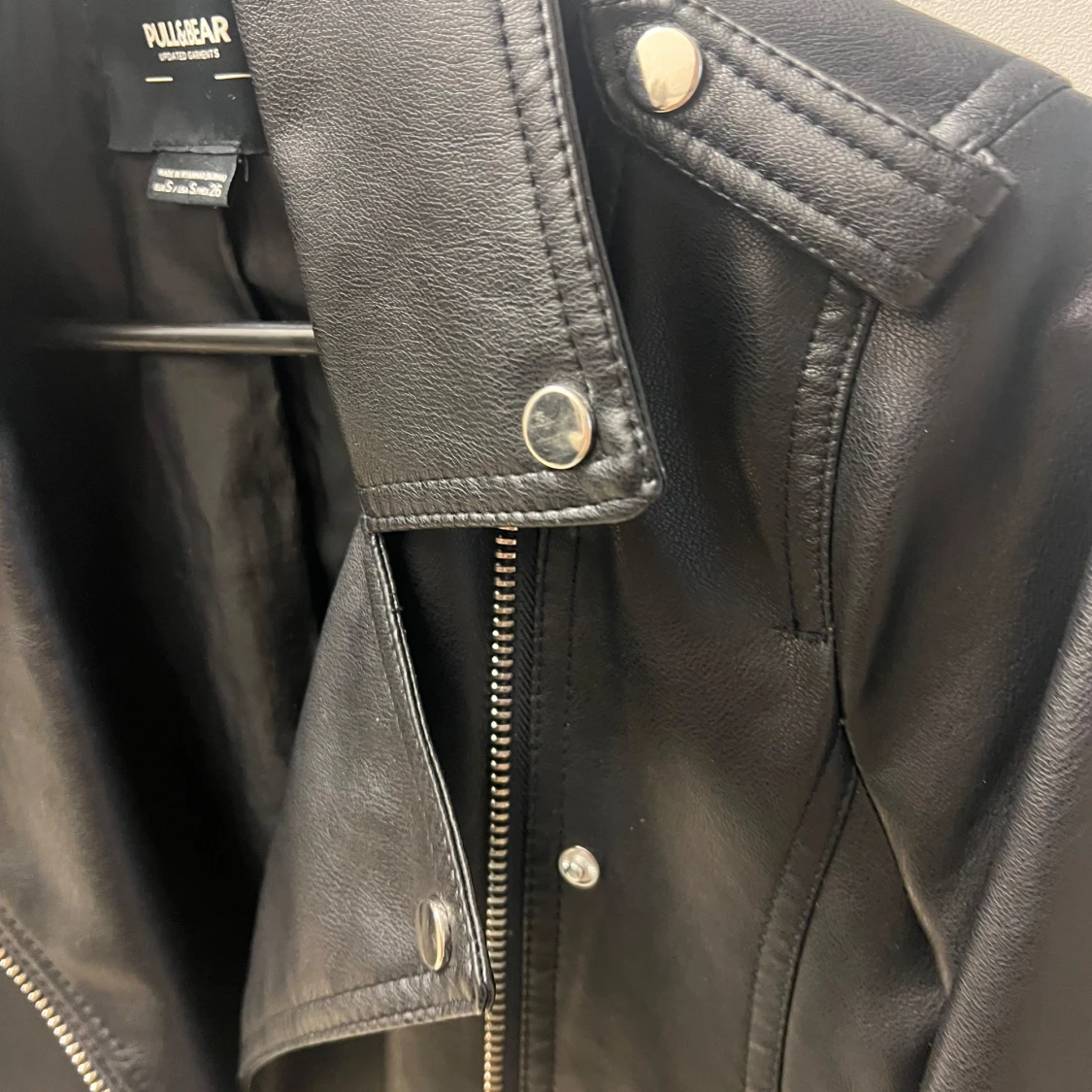Säljer en svart skinnjacka från Pull&Bear med klassisk bikerstil. Jackan har silvriga dragkedjor, knappar och bälte i midjan. Snygg krage och fickor framtill. Perfekt för dig som vill ha en edgy look. Pris kan såklart diskuteras. Ställ jättegärna frågor om du har några funderingar.