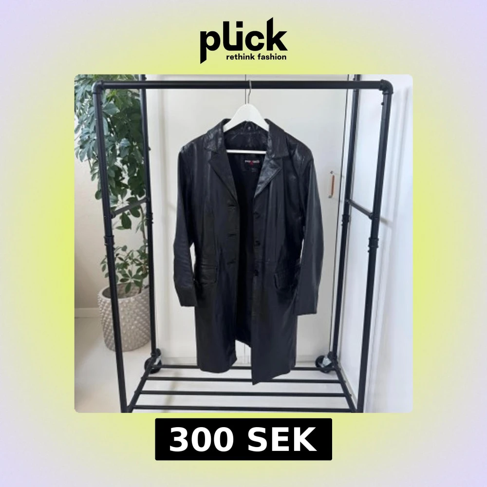 Snygg svart skinnkappa med klassisk krage och knappar framtill. Rocken har långa ärmar och två fickor framtill. Perfekt för en stilren look.