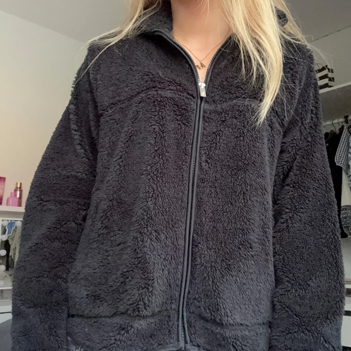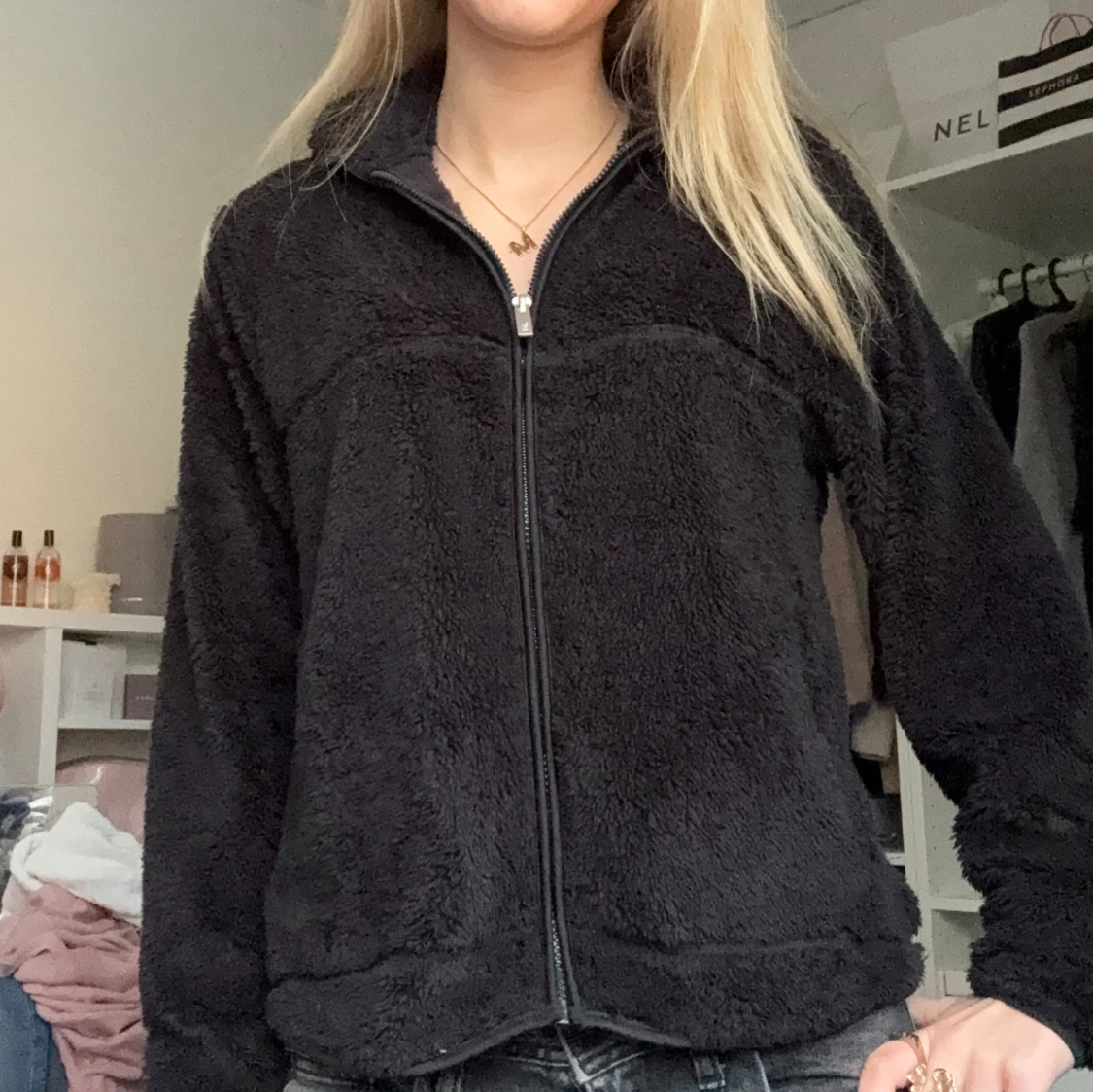 Mysig svart teddyjacka med hel dragkedja. Jackan har en normal passform och är perfekt för sen sommarkväll eller höst och vår. Använd max 5 gånger! 💕💕
