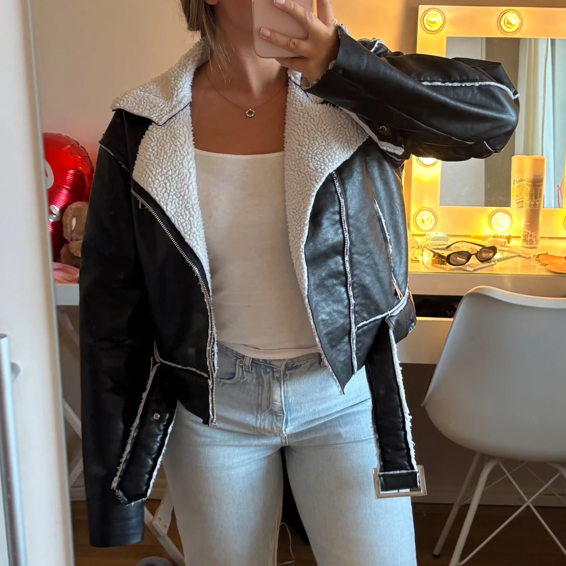 Säljer en svart teddyjacka från Nelly i storlek 34. Jackan har vit teddyfoder, bred krage och coola detaljer som bälte i midjan och dragkedjor. Perfekt för dig som vill ha en snygg och trendig look under höst och vinter.