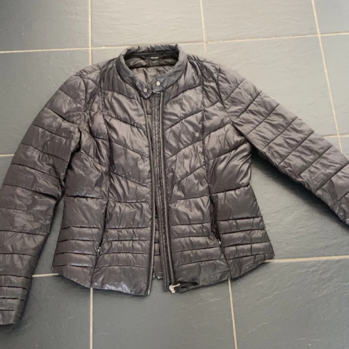Snygg svart vår/höst jacka med quiltad design och dragkedja framtill. Jackan har en hög krage med tryckknapp och långa ärmar. Perfekt för kyliga dagar och enkel att matcha med olika outfits.