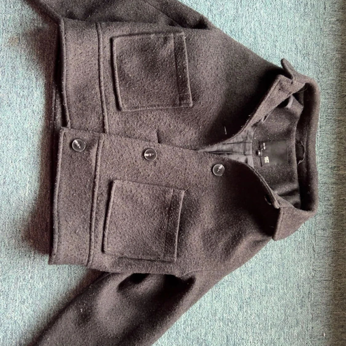 Kort svart kappa från 157 i ull med två stora fickor framtill och knäppning med knappar. Klassisk krage och stilren design som passar perfekt till höst och vinter. Snygg och enkel att matcha med olika outfits.