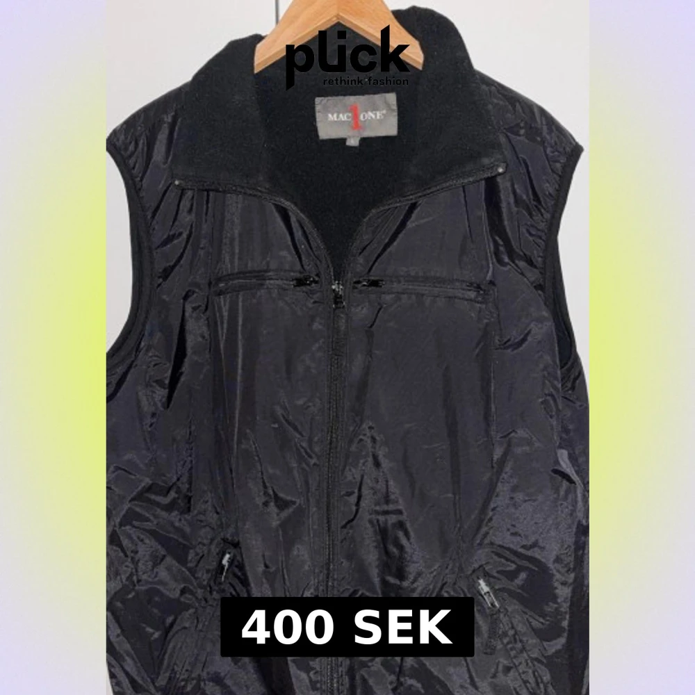 Svart väst från Mac One med hög krage och flera dragkedjefickor framtill. Tillverkad i blankt syntetmaterial med fleece på insidan av kragen. Perfekt för lager-på-lager och har en sportig vibe.