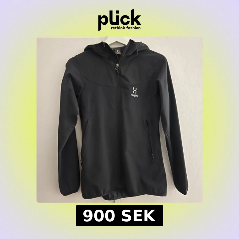Säljer en svart vindjacka från Haglöfs med huva och dragkedja framtill. Jackan har långa ärmar och två fickor med dragkedjor. Perfekt för blåsiga dagar.
