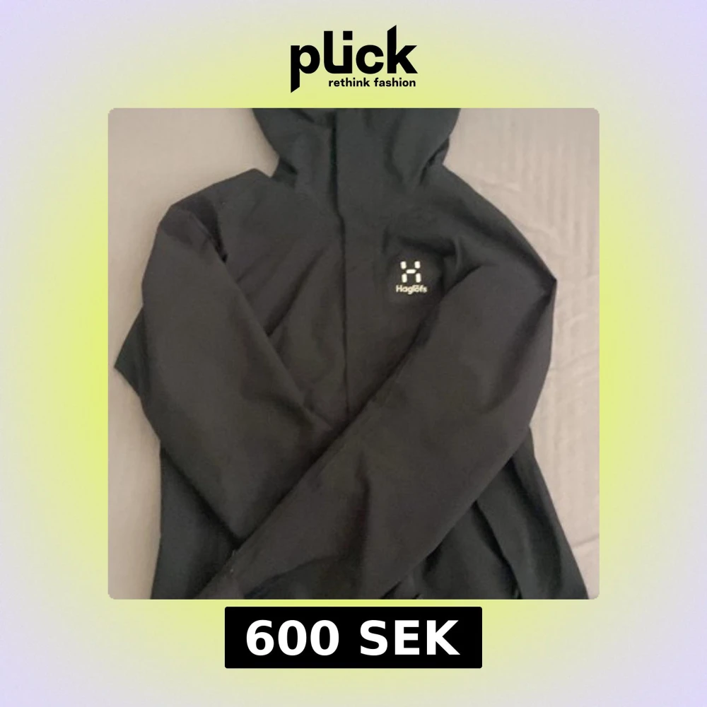 Säljer en svart vindjacka från Haglöfs med huva och dragkedja. Jackan är tillverkad i ett slitstarkt material och har en stilren design med logotypen broderad på bröstet. Perfekt för utomhusaktiviteter.