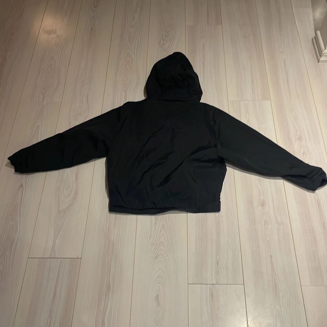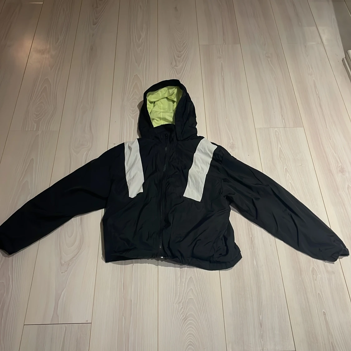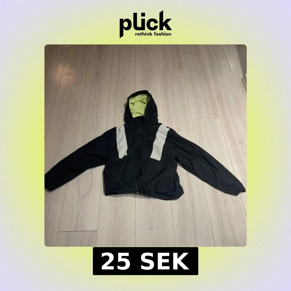 Säljer en svart vindjacka från Lindex med huva och vita detaljer. Jackan har en dragkedja framtill och är perfekt för blåsiga dagar. Insidan av huvan är ljusgrön vilket ger en cool kontrast och har reflex på framsidan av jackan. Passar bra för både vår och höst ✅