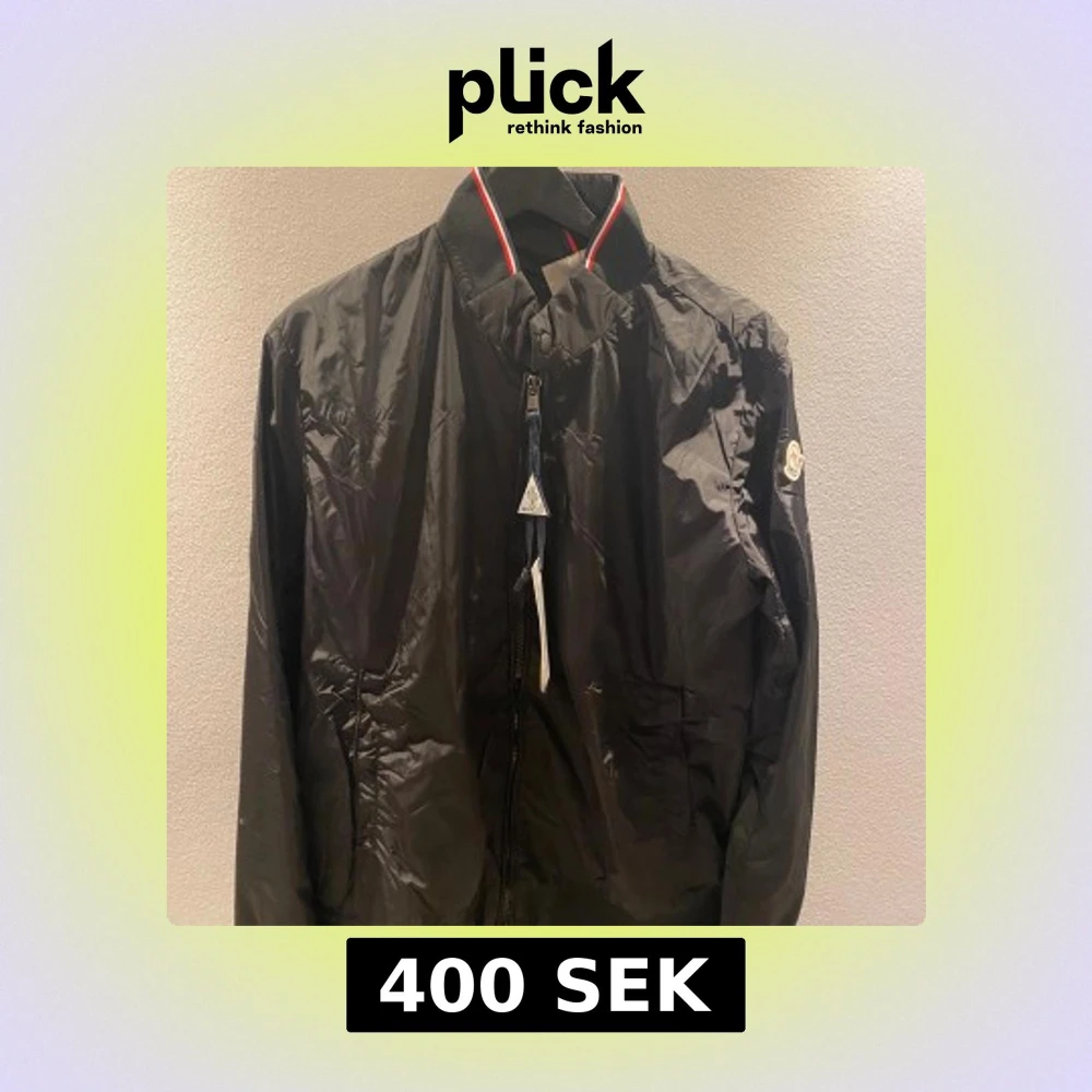Säljer en svart vindjacka från Moncler med dragkedja framtill och klassisk krage med röd och vit rand. Jackan har Moncler-logga på ärmen och är tillverkad i lätt polyester. Perfekt för dig som vill ha en stilren och sportig look.