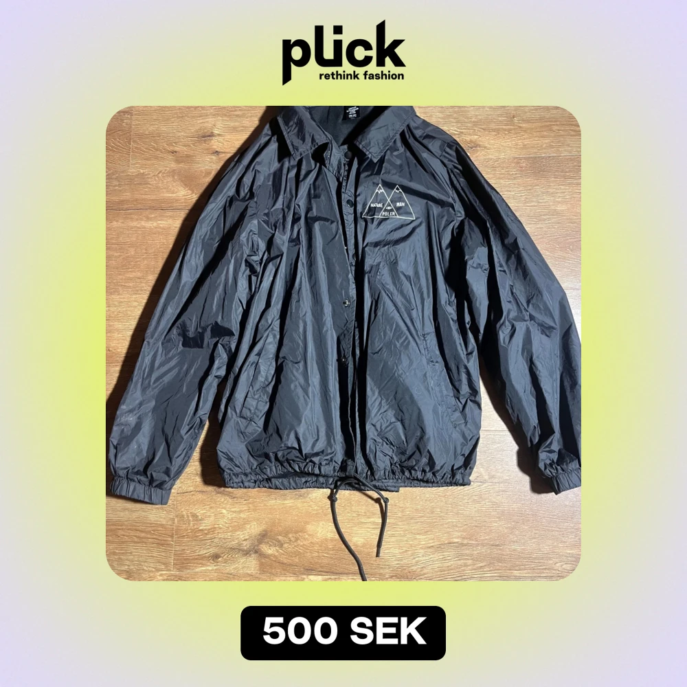 Säljer en svart vindjacka från Poler med coolt tryck på både fram- och baksidan. Jackan har en dragkedja och knappar framtill samt justerbar dragsko i nederkant. Perfekt för blåsiga dagar och en stilren look. Passar till både vardag och äventyr!