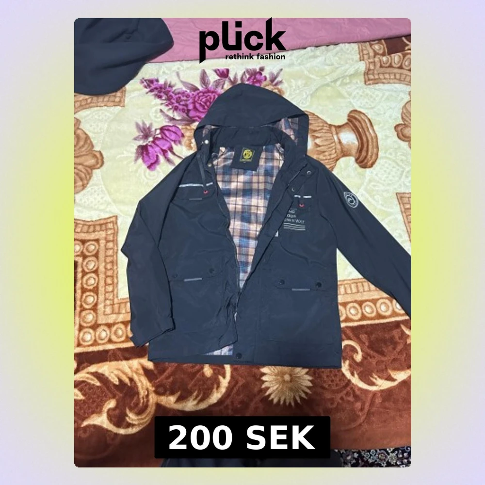 Svart vindjacka från Leduntino i storlek M. Jackan har huva med snörning, två stora fickor framtill och coolt tryck på bröstet. Insidan är fodrad med rutig beige och blå textil. Perfekt för dig som gillar street och vill ha en snygg jacka med detaljer.