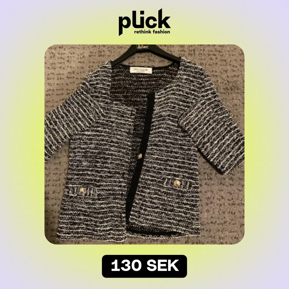 Säljer en elegant svartvit kavaj/kofta. Den har ett snyggt randigt mönster och långärmad. Kavajen är dekorerad med fina knappar framtill och vid fickorna. Perfekt för både vardag och fest!1knapp