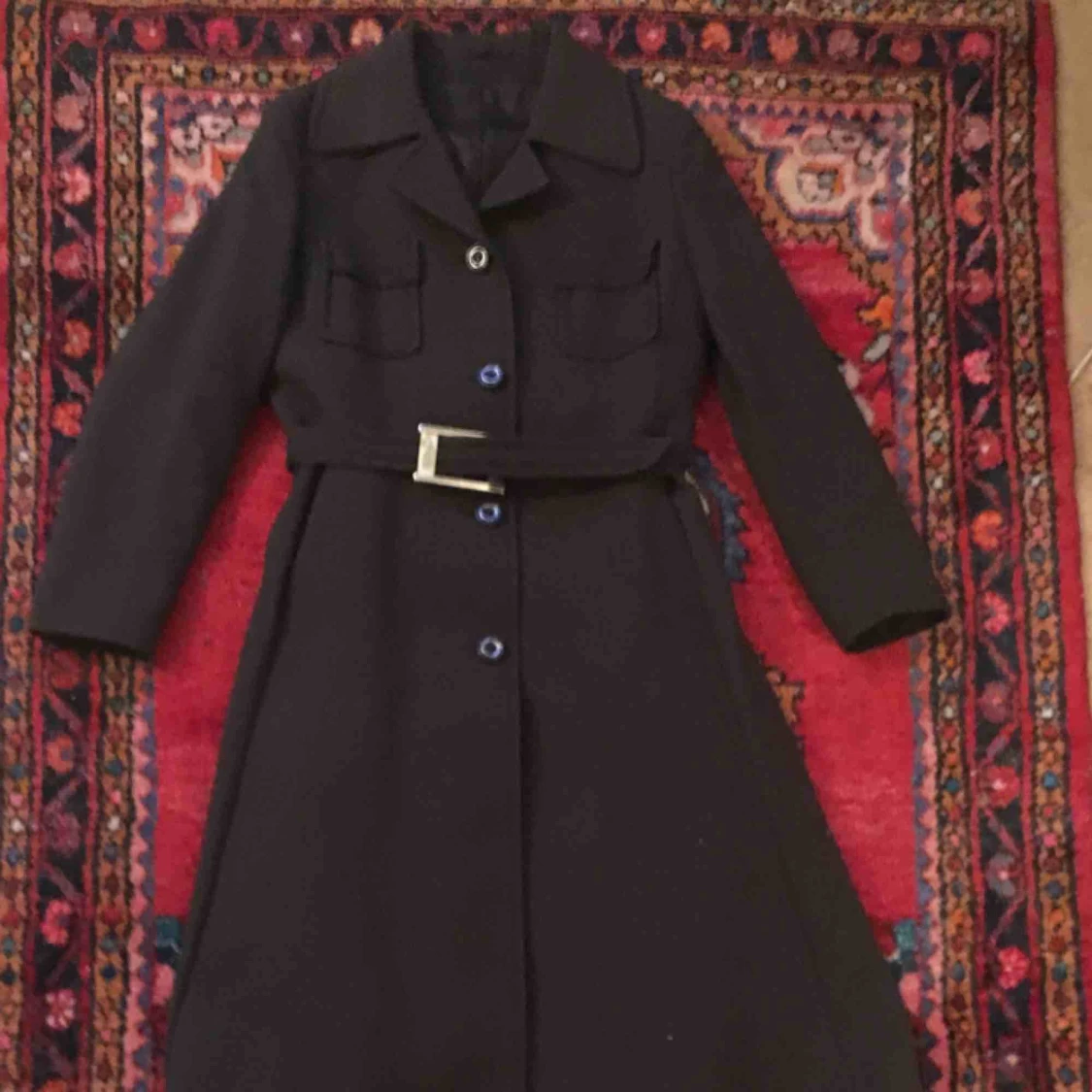 Väl omhändertagen figursydd, äldre svart kappa med fickor, och skärp i midjan. Stängs med knappar. Köpt på vintage butik. Aldrig använd av mig, bara testad hemma, står 42 i len skulle säga att den passar M/L.