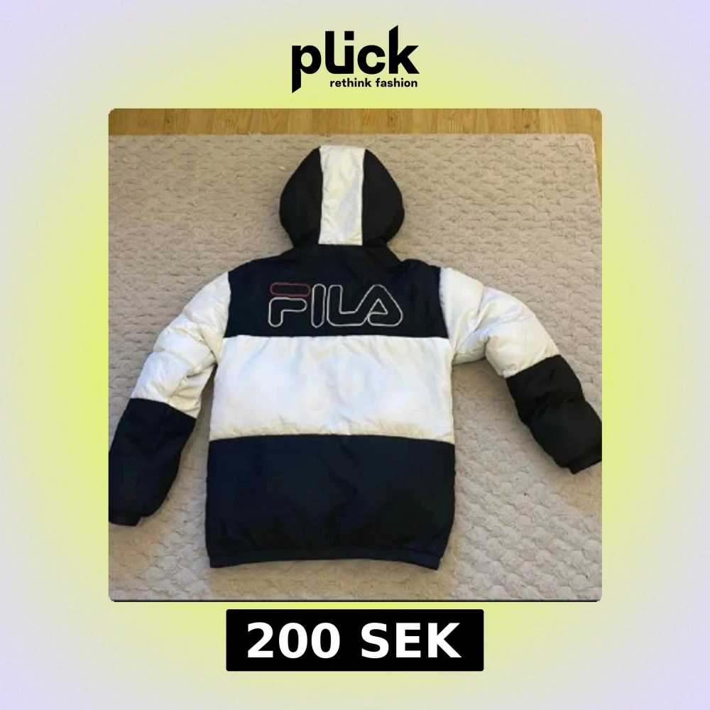 Säljer en snygg pufferjacka från FILA i svart och vitt med stor logga på ryggen och mindre logga på bröstet. Jackan har huva, dragkedja framtill och två sidofickor med dragkedja. Perfekt för kalla dagar och har en cool, sportig vibe. Använd under en vinter