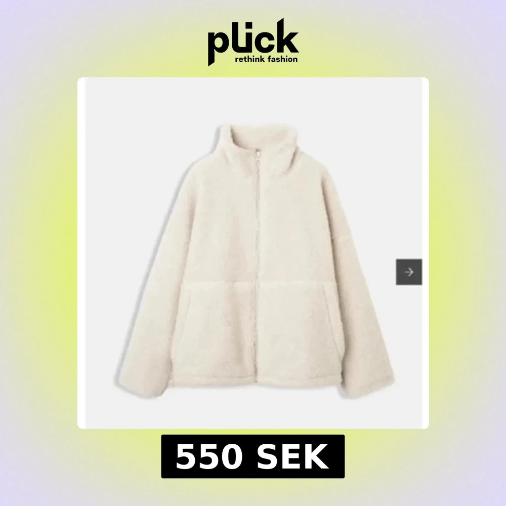 Mysig beige teddyjacka med dragkedja och hög krage. Perfekt för kyliga dagar med sin fluffiga och varma design. Jackan har långa ärmar och två praktiska fickor framtill.