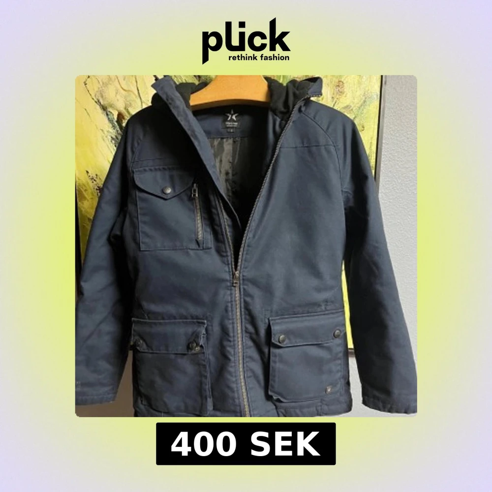 Säljer en mörkblå jacka från Texstar med huva och flera praktiska fickor. Jackan har dragkedja och knappar framtill samt en stilren design. Perfekt för våren! Jackan är i väldigt bra skick och inga tecken på användning.
