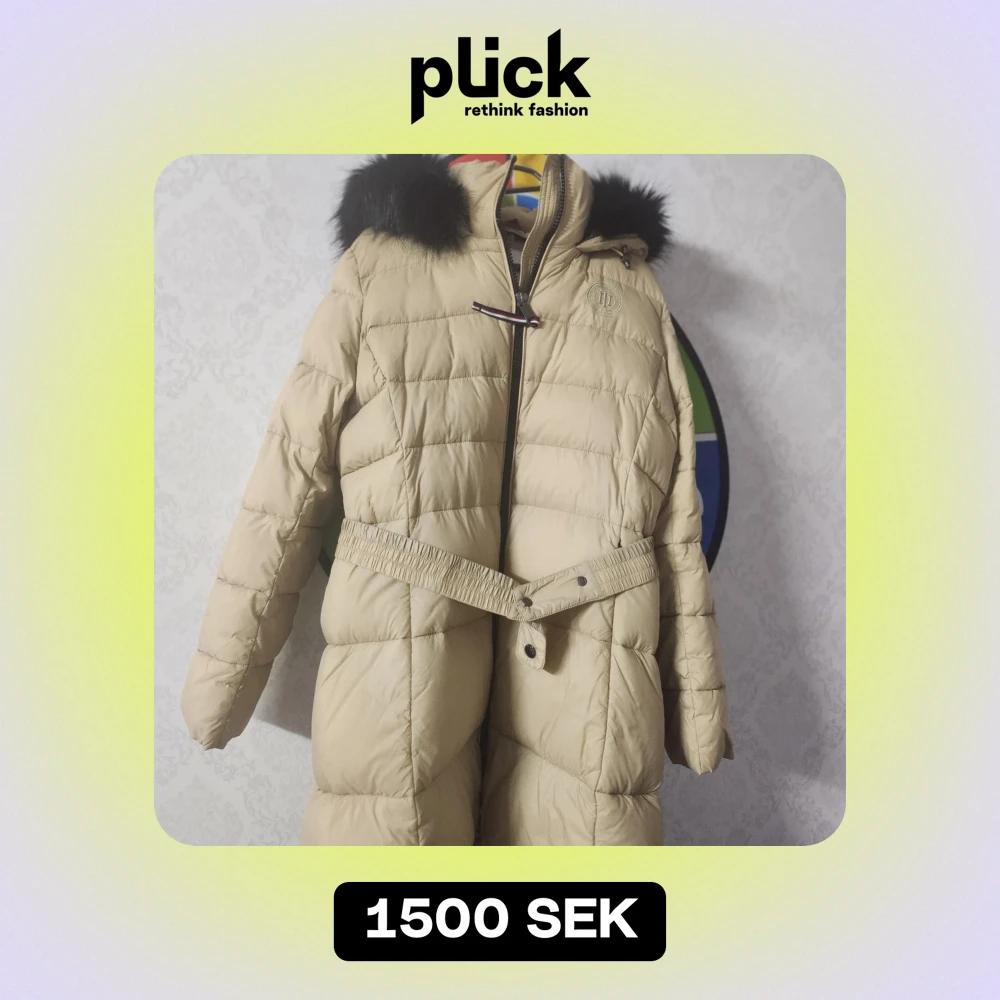 En snygg beige vinterjacka med svart pälskrage. Jackan har en dragkedja och knappar framtill och en bälte i midjan. Jackan är fodrad och har två fickor framtill. Användt några gånger Storlek L men passar M också