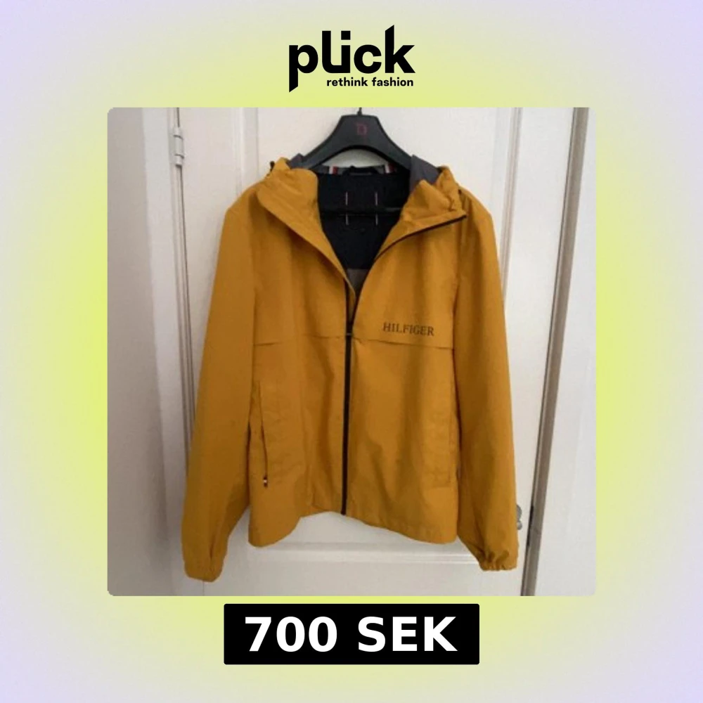 Snygg gul vindjacka från Tommy Hilfiger med huva och dragkedja. Jackan har svarta detaljer, logga på bröstet och ärmen samt innerfoder med grått tyg och röd-vita ränder. Perfekt för blåsiga dagar och enkel att matcha med jeans eller sneakers. Pris kan diskuteras