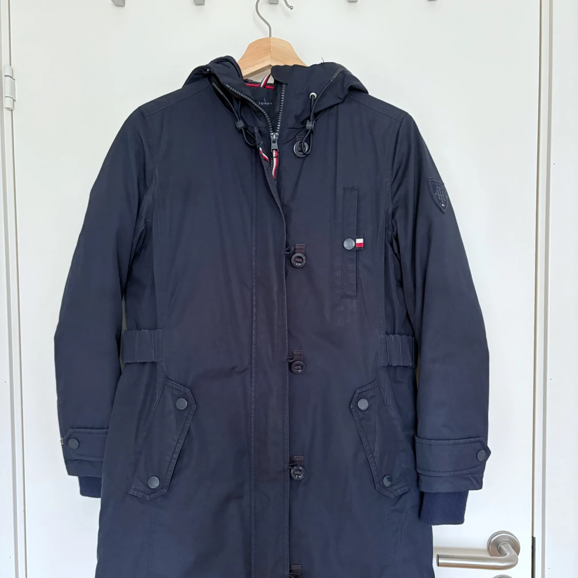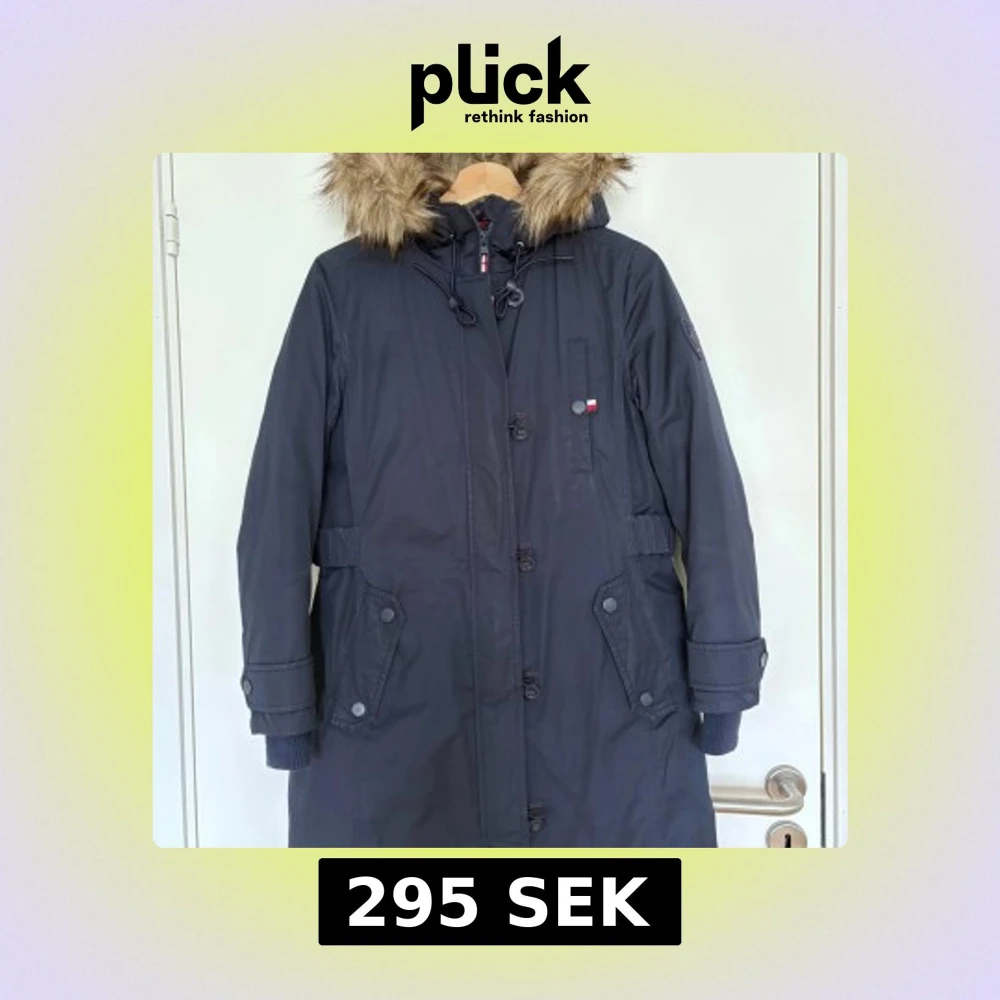 Snygg mörkblå parkas från Tommy Hilfiger med avtagbar huva med fejkpäls, stora fickor och ribbade muddar. Jackan har både dragkedja och knappar framtill samt justerbar midja. Perfekt för kalla vinterdagar. jag köpte i USA, det står storlek XXS men det är mer en XS (jag brukar ha storlek xs/34 från H&M). Den har tecken på slitage men är överlag i fint skick, den är fortfarande lång att bära