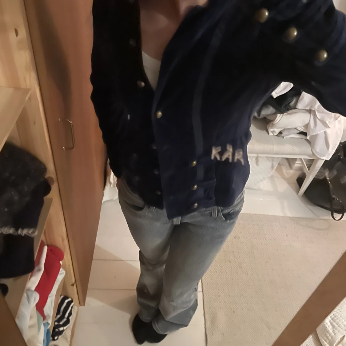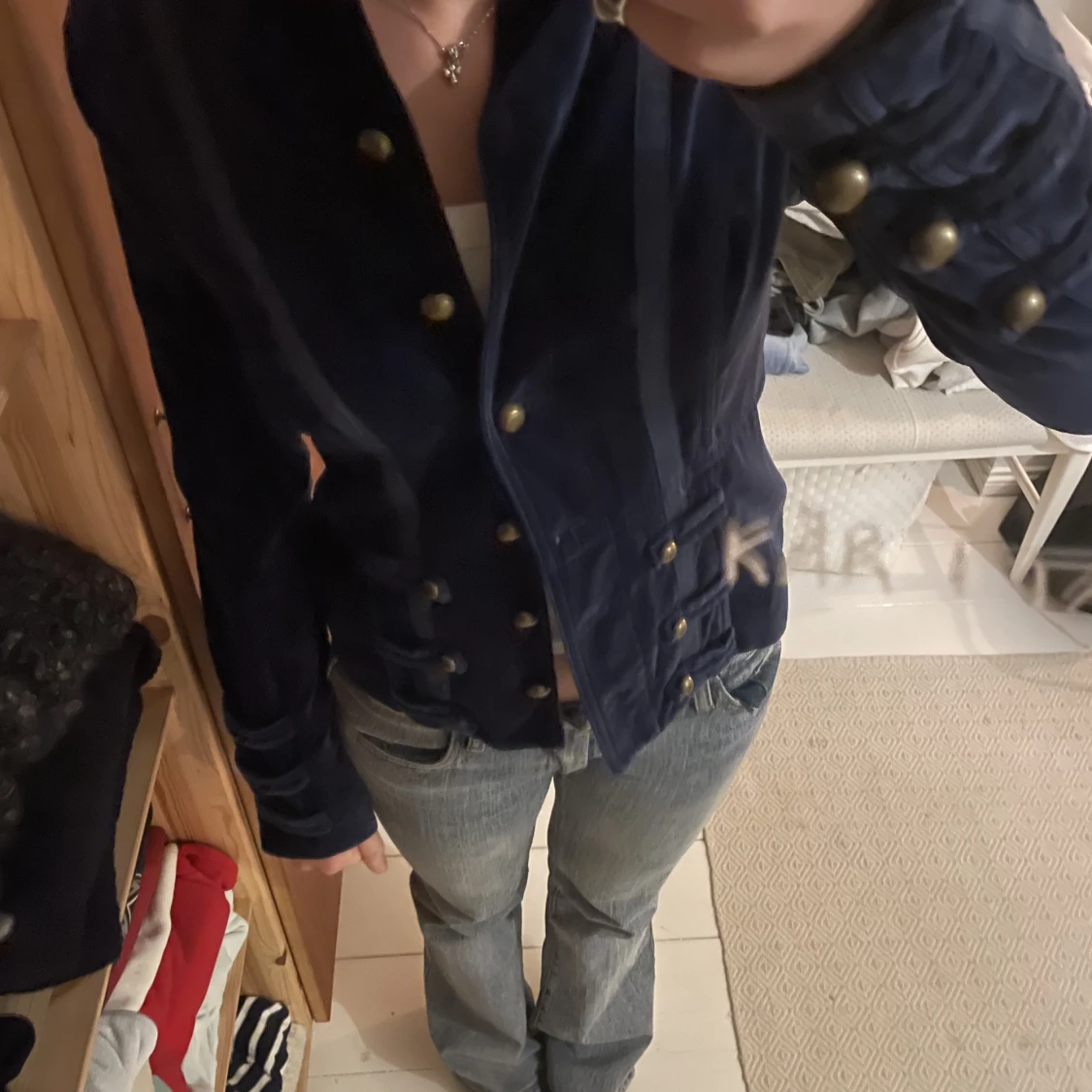 Skitcool marinblå fodrad sammetsjacka! Mycket detaljer framtill ingeting baktil! Jöttebra skick💕