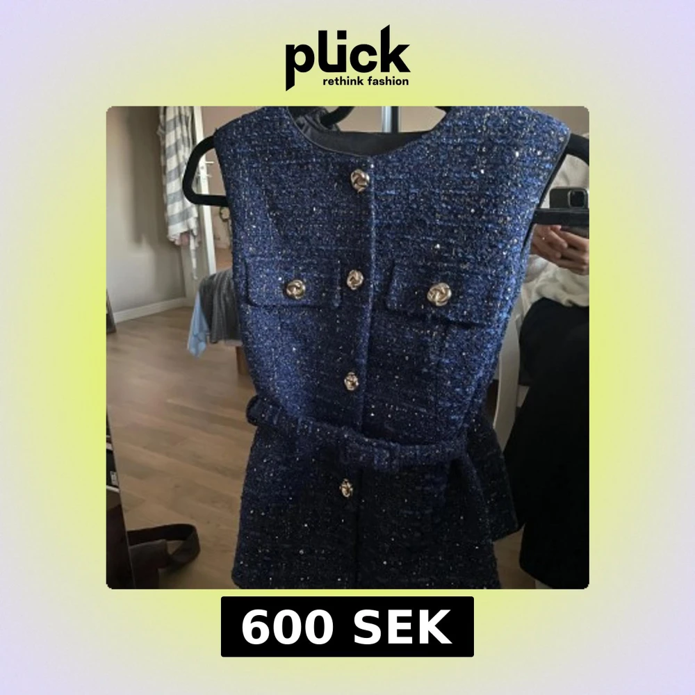 Snygg mörkblå väst i glittrigt tyg med guldiga knappar framtill och två fickor på bröstet. Västen har ett matchande bälte i midjan och är ärmlös med rund halsringning. Perfekt för att lyfta vilken outfit som helst.