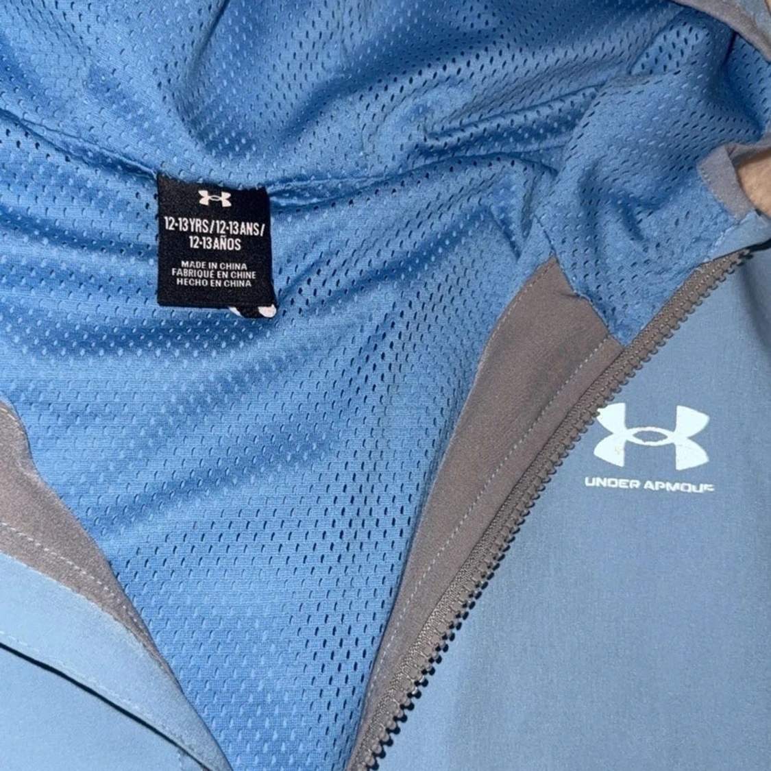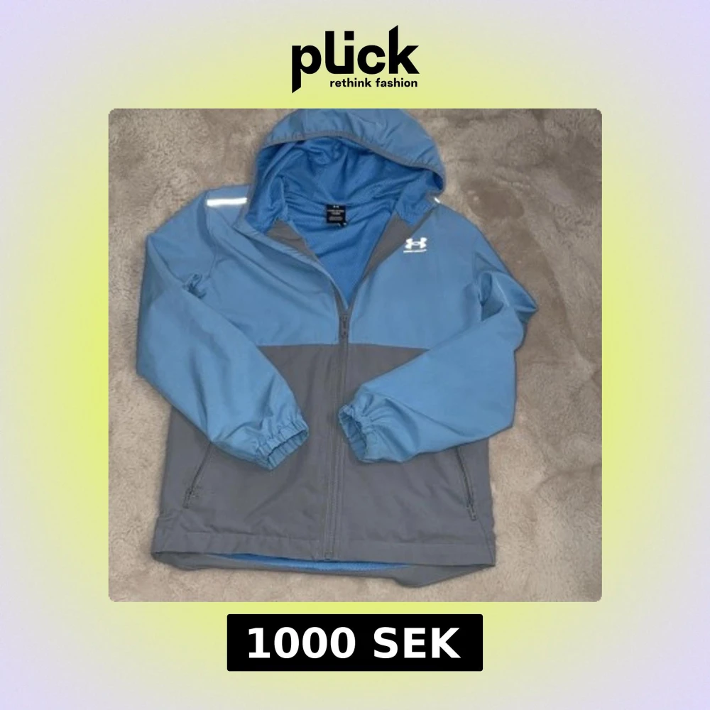 Snygg vindjacka från Under Armour i blått och grått med huva och meshfoder. Jackan har dragkedja framtill, elastiska muddar och två sidofickor med dragkedja. Perfekt för aktiva dagar och sportiga outfits.