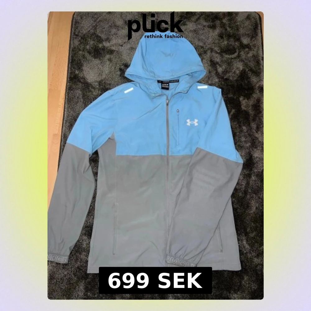 Säljer en snygg tvåfärgad vindjacka från Under Armour i blått och grått. Jackan har huva, dragkedja hela vägen, bröstficka med dragkedja och reflekterande detaljer på axlarna. Perfekt för blåsiga dagar och sportiga outfits.