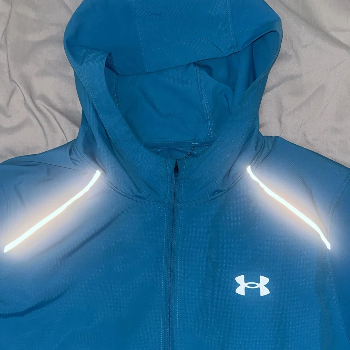 Blå vindjacka från Under Armour med huva, hel dragkedja och reflekterande detaljer på axlarna. Jackan har logga på bröstet och stor text på ryggen. Tillverkad i lätt polyester, perfekt för träning utomhus. Snygg och sportig look.