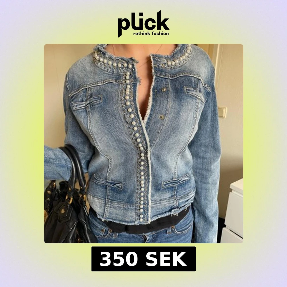 Snygg jeansjacka med pärlor längs kragen och knappslån. Jackan har en fransig kant och två bröstfickor. Perfekt för att ge din outfit en cool touch. Storlek M men sitter som S-XS🩷 köpt av en tjej på plick men kommer tyvärr inte till användning! Det är förra ägarens bilder🩷