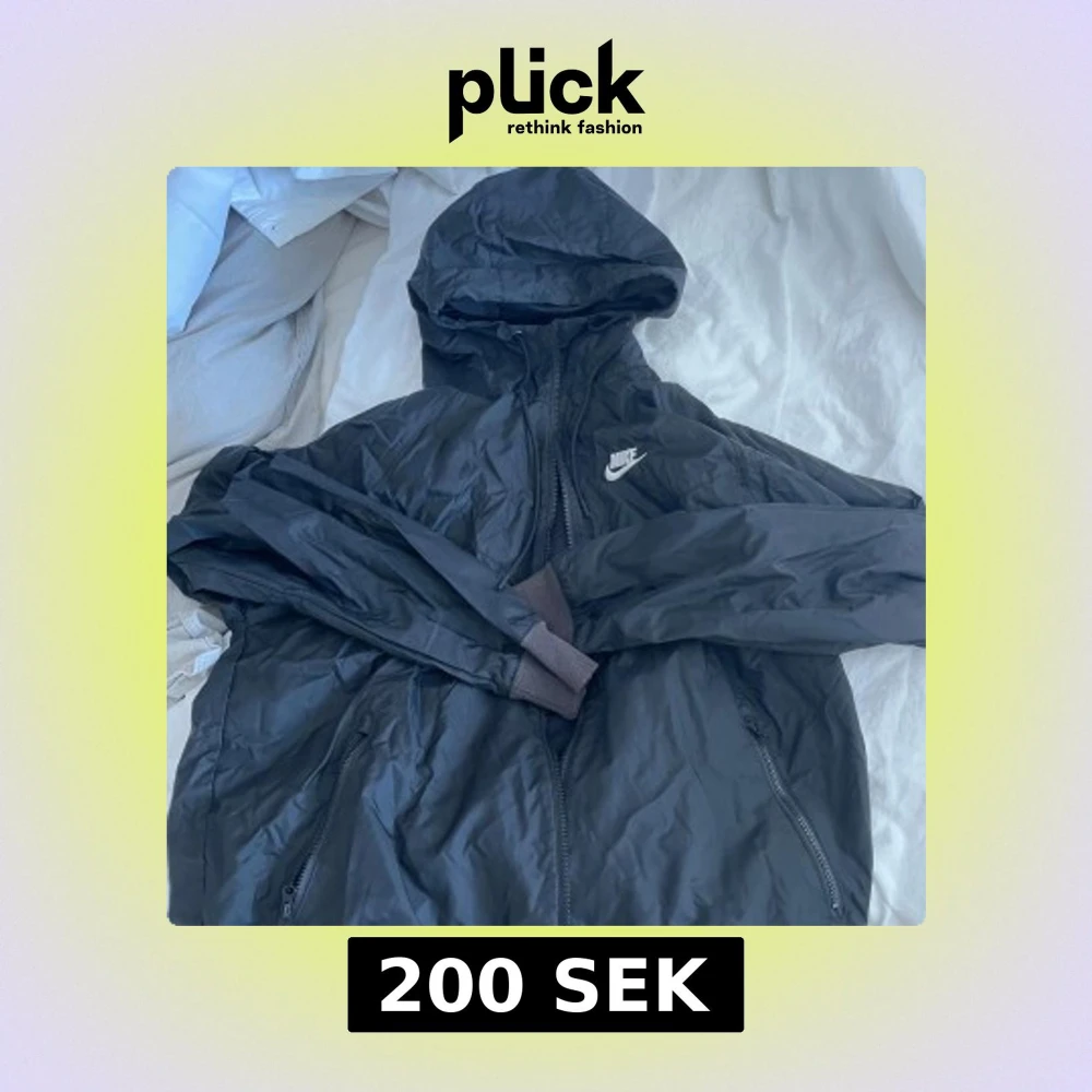 Svart vindjacka från Nike med huva och dragkedja framtill. Jackan har långa ärmar med muddar och två fickor med dragkedja. Perfekt för blåsiga dagar och enkel att slänga på sig när du är på språng. storlek S, ny kostar 1000kr frågor? skriv.